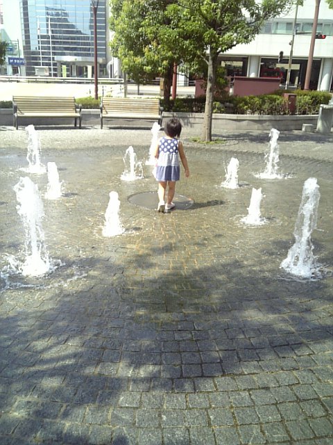 ホテルの前にある噴水でちょっと遊びました。これから、どこか近くのスーパーで買い物&遊ばせてから帰路につきたいと思います。