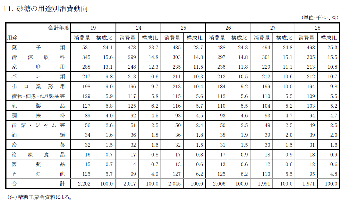 さて、砂糖の消費量は減っていることを示してきましたが、砂糖の用途として、
