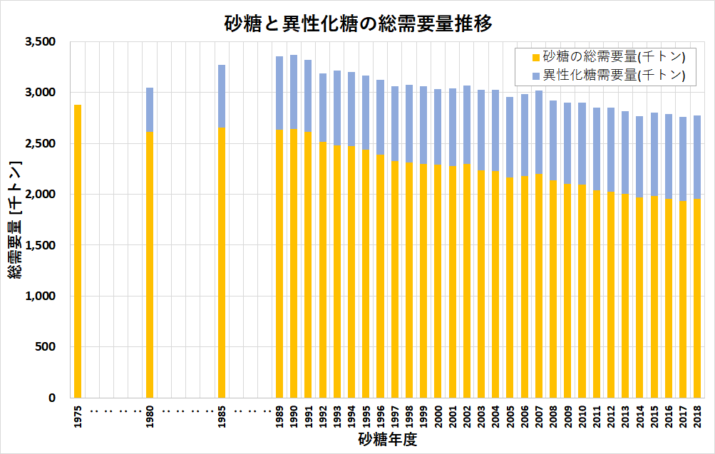 異性化糖を積み上げると総需要量は増加し、1990年に極大を迎えていました。
