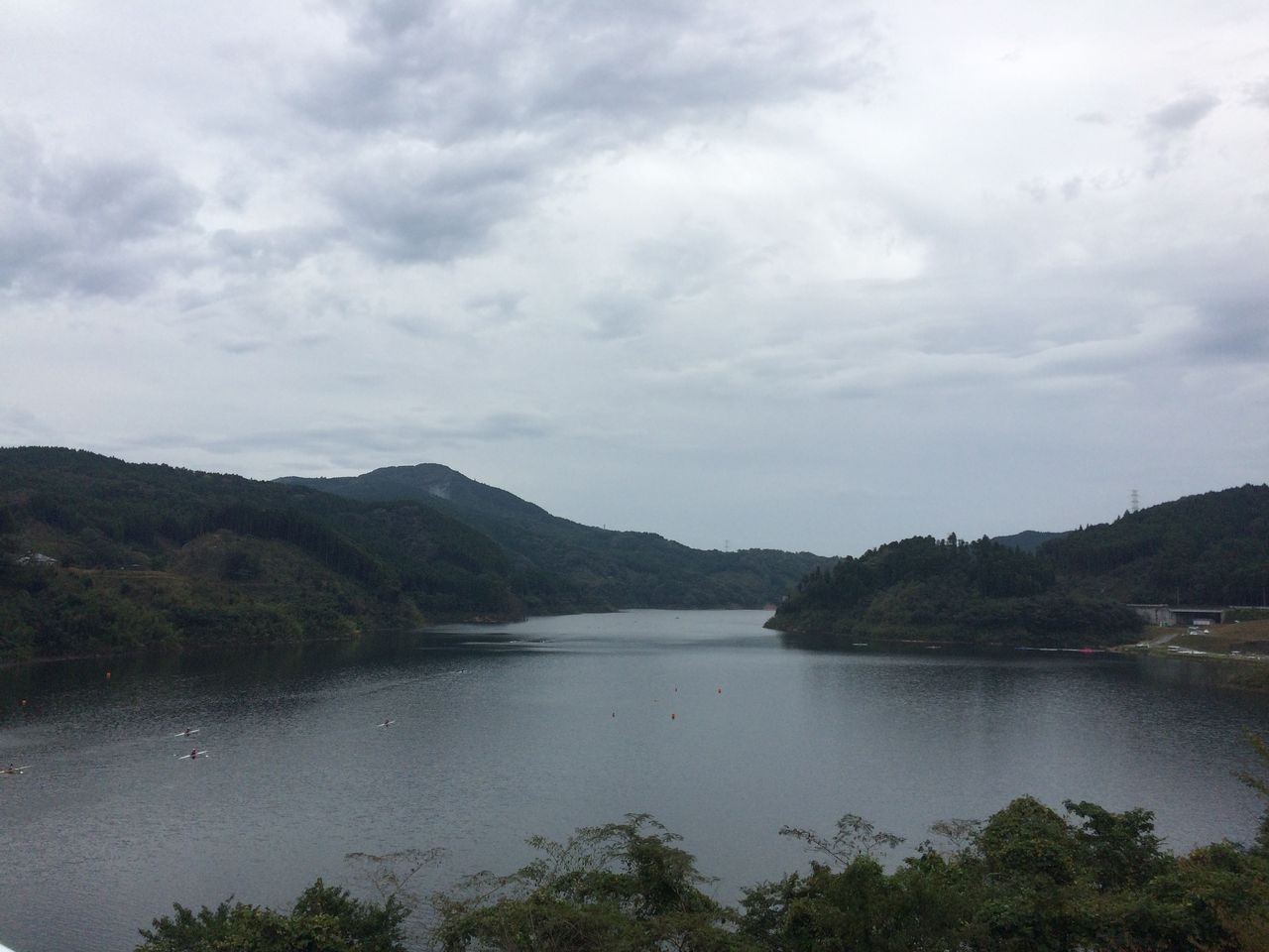 この大きなダム?では、大学生らしき集団がボートの練習をしておりました。