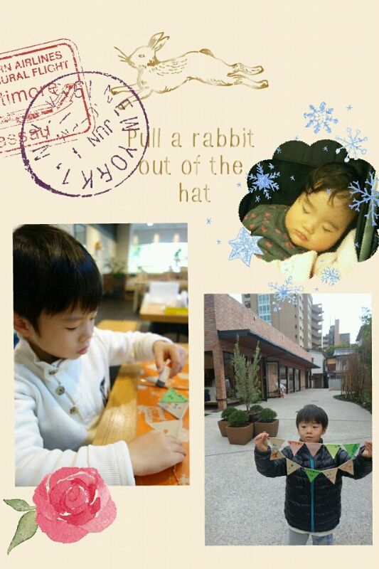 次に向かったのは土屋鞄という、佳維のランドセルを購入した素敵なお店。ランドセル製作の過程で出る余り革を使ったワークショップが開催されているのだ。ランドセル受付は既に終了しているためかお客さんは他におらず、ゆったりとフラッグオーナメント製作に打ち込む母子。赤子はその辺を徘徊したり、時々お店から脱走しようとして母やスタッフさんに捕まったり。