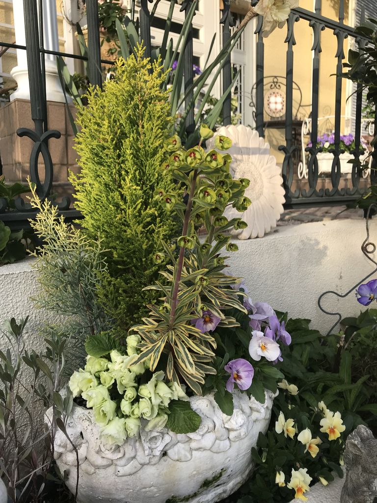 寄せ植えのユーフォルビアのお花が咲きました