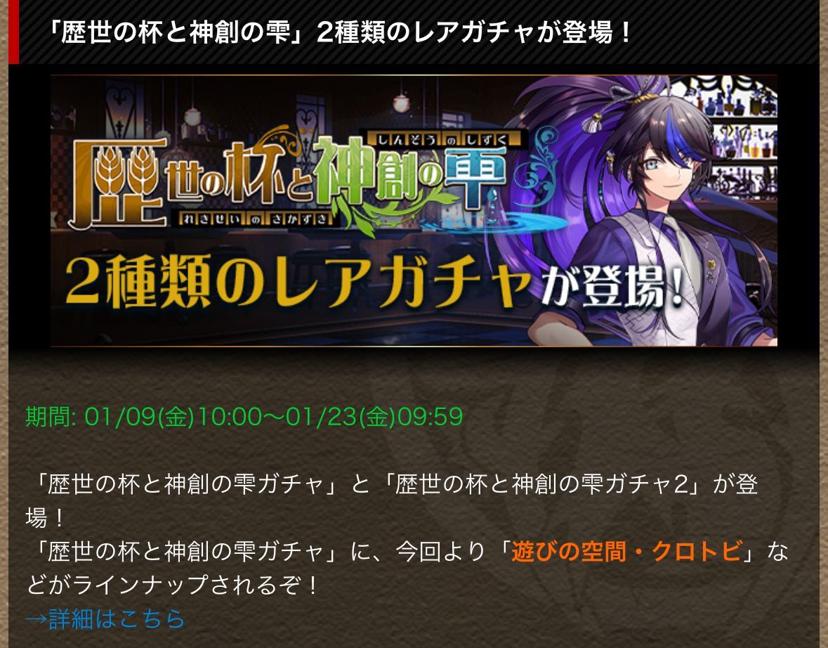 歴世の杯と神創の雫ガチャに今回より遊びの空間・クロトビなどがラインナップされるぞ!