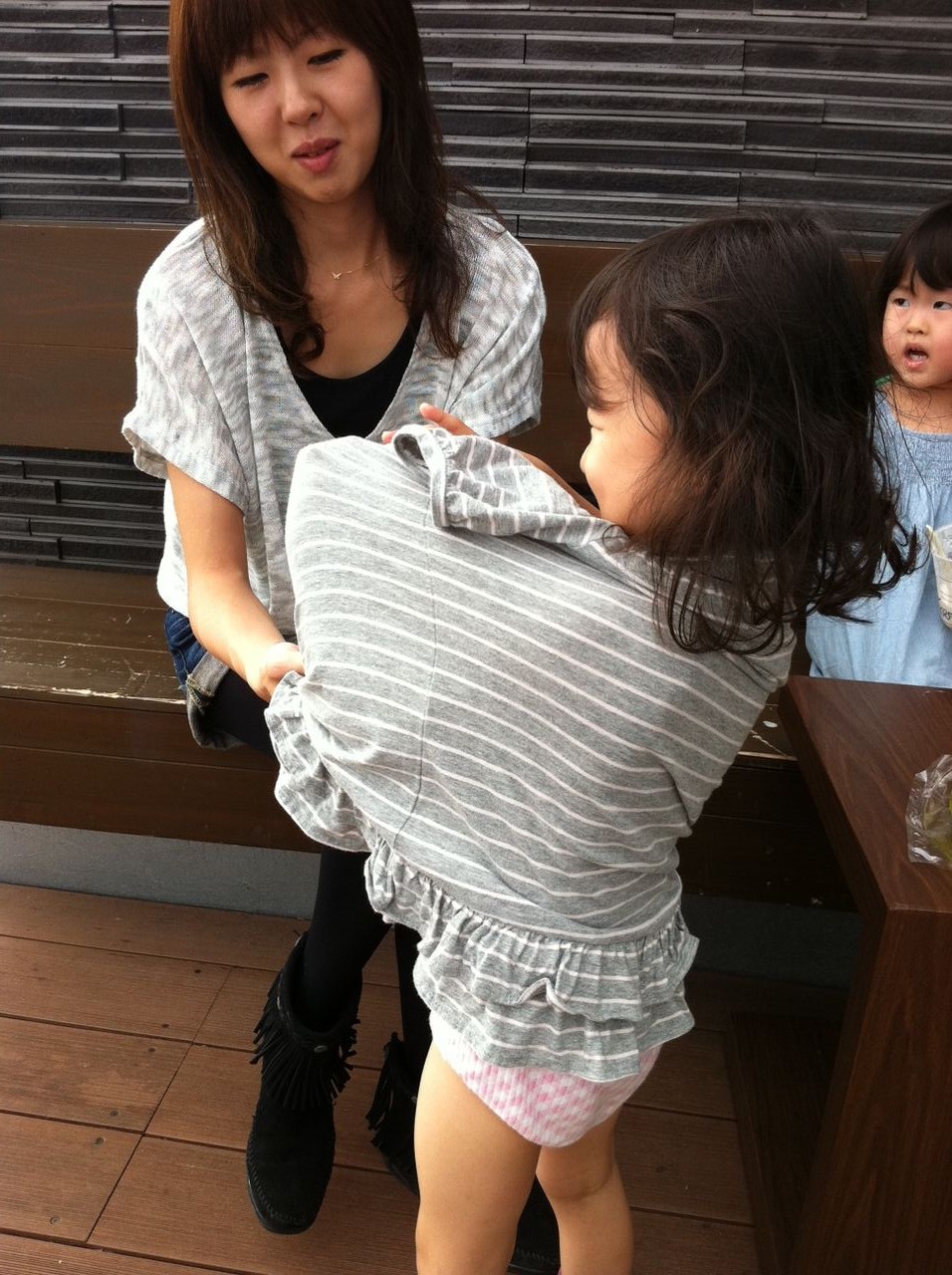 実は先程の写真で右の次女ここはの服が前後ろ反対でした