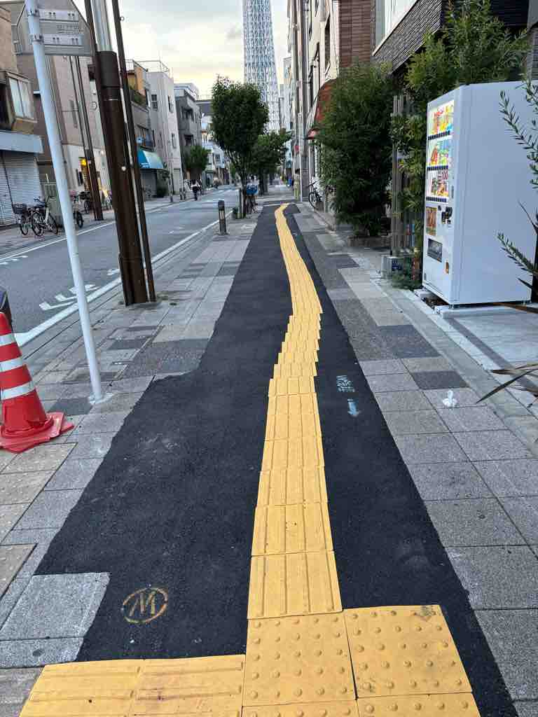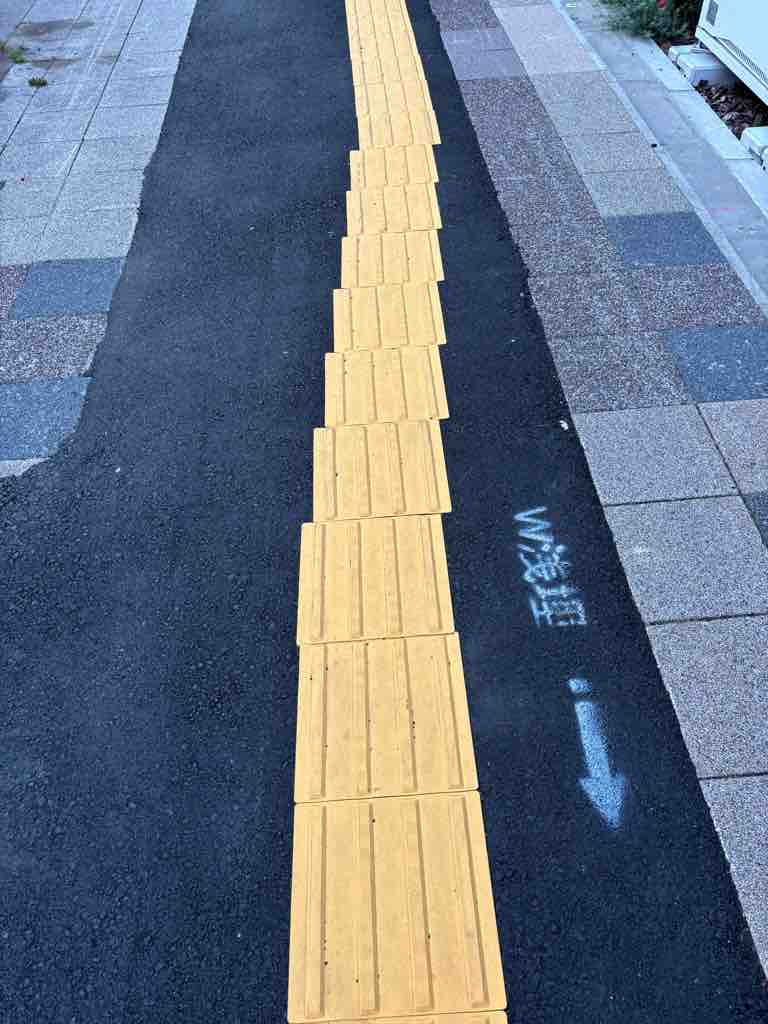 近所の水道工事?下水道工事?どちらか、忘れましたが、工事後のずさんな復旧工事。視覚障害者用誘導ブロックが、波打っている。本来は直線のはず!