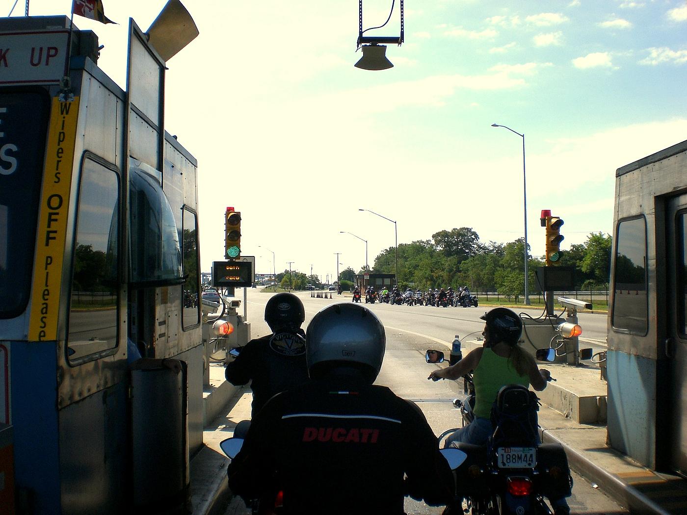 橋の手前の料金所です。順番に支払って一人ずつ抜けます。抜けきったら、右に一時停車して全員揃うのを待ってくれています。グループの責任者は、先頭と最後尾の位置を取ります。ハグレライダーを作らないように注意してくれるので、赤信号に引っかかっても、置いて行かれる心配はありません。