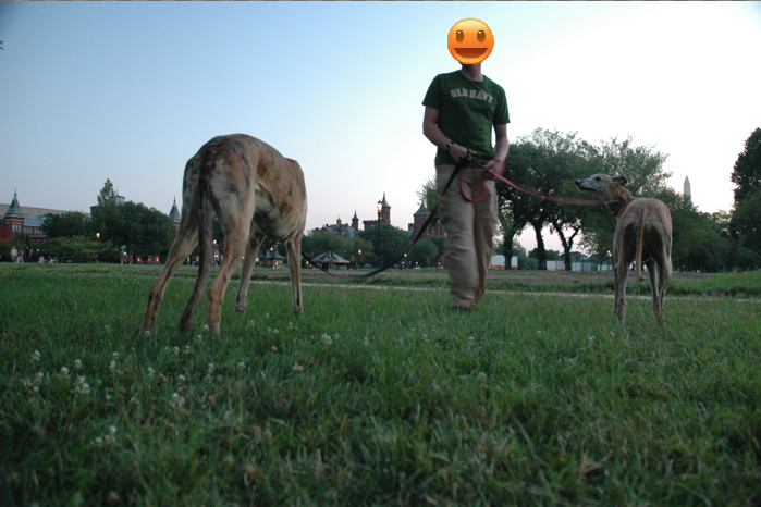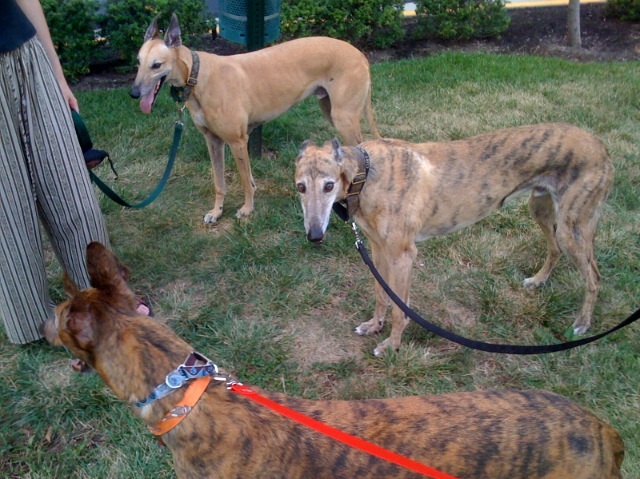 グレイハウンドがこの辺で普通に散歩しいるのを見るのははじめて。2匹ともCurtと同じ9歳で、2〜3週間前に保護されたばかり。だから会った事無かったのね。