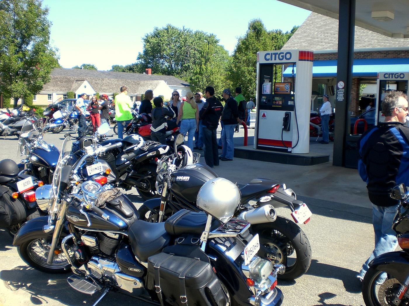 途中でガソリン補給。真ん中で、赤バイクの横で水補給してるおチビが私。横の黄緑シャツのネエサンは、ハーレーにカップホルダーを付けていて、ハーフフェイスのヘルメットなので、走りながら水飲んでました。ちょっとうらやましい・・・でも、顔が虫だらけになりそうで、ハーフフェイスだけは嫌です。