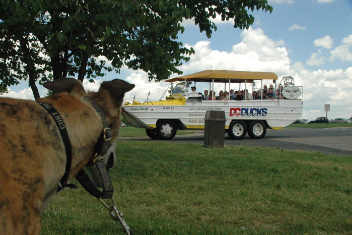 個人所有のボートの以外に、こんなのもあります。ワシントンDC中心のユニオンステーションから陸路でここまでやって来るみたい。乗った事ないから、多分、ですけど。水陸両用の観光ボート「DC Ducks」。川から上がって来たところです。乗ってる間は観光客はDucks、としてアヒルのガァガァっていう鳴き声のでる笛?みたいな物を持ってます。運転手/操縦士さんがCurtを見て、乗員にガァガァ攻撃を指示。「ん?なんじゃ?」と聞き耳を立てるCurt。