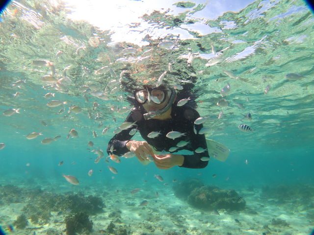 また、青の洞窟側のビーチに比べると魚の大きさは小柄ですが、とてもカラフルで写真映えする魚が多く、面白いですよ。