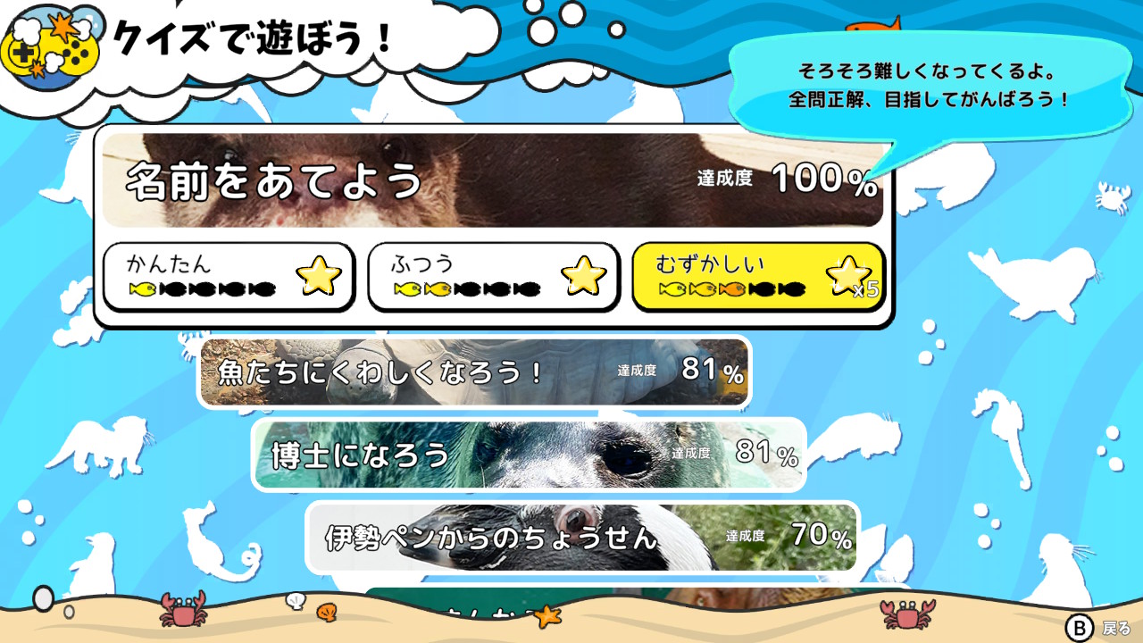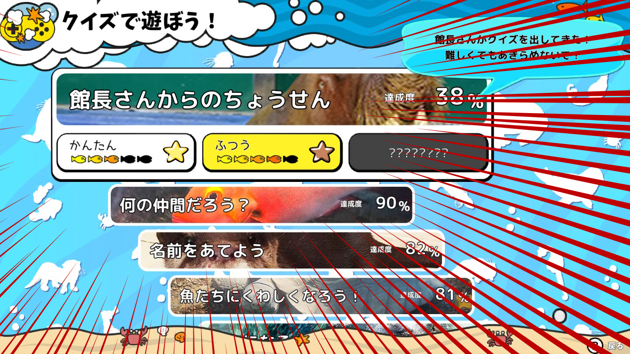 もちろん「館長からのちょうせん」以外はまともな難易度ですので、楽しい水族館まったり図鑑&クイズゲームだと思っていただければ幸いです!水族館公式はどんどんゲームを発売していこう!