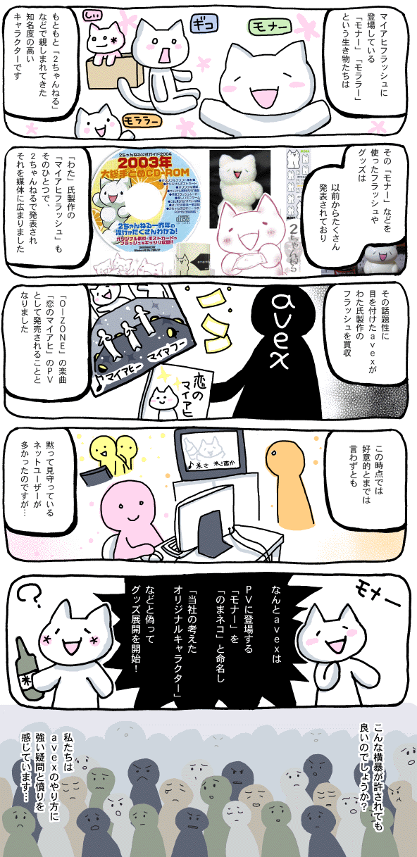 数多くのクリエイターたちが匿名で「モナー」というキャラクター製作に関わってきたのは、モナーが「みんなのもの」という暗黙の了解があったからでした。そんな「モナー」を盗用し、商業利用をはじめたのが今回の問題。