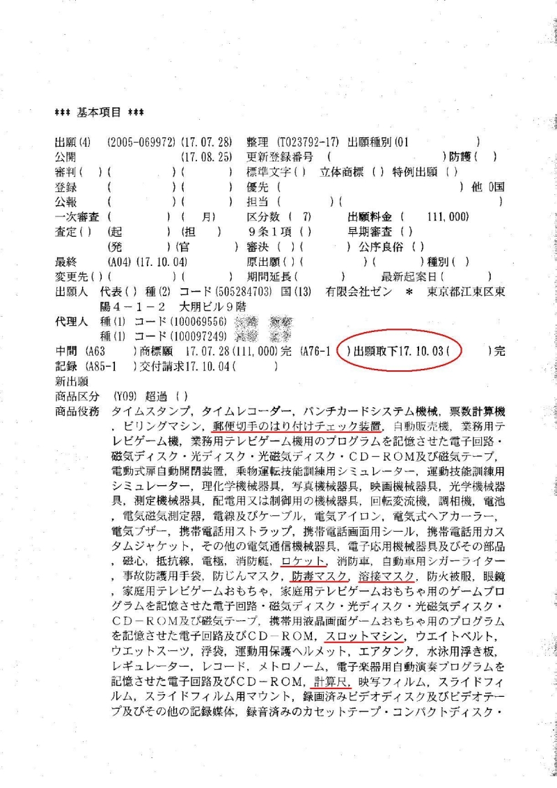 やはり1次情報に当たらないで憶測で物を書いたり、電話に誰も出ないらしい会社の発表を当てにしてはいけませんね。(財)日本特許情報機構の複写サービスを利用し、商標登録出願書類一式(包袋)のコピーを入手しました。たしかに出願が取り下げられたことを確認できます。大事な戦利品。包袋の一部を引用するかたちでここにアップロードします。赤色の書き込みは当ブログ管理人によるものです。特許庁相談部に連絡し、特許庁としては、私がウェブサイトに本書類をアップロードすることを差し止めるものでないと確認しました。なお、私的使用のための複製はかまいませんが、本書類の再配布・再掲示はご遠慮ください。もし書類の掲示に問題がございましたら、直ちにprotectmona@hotmail.comに電子メールでその旨お伝えください。