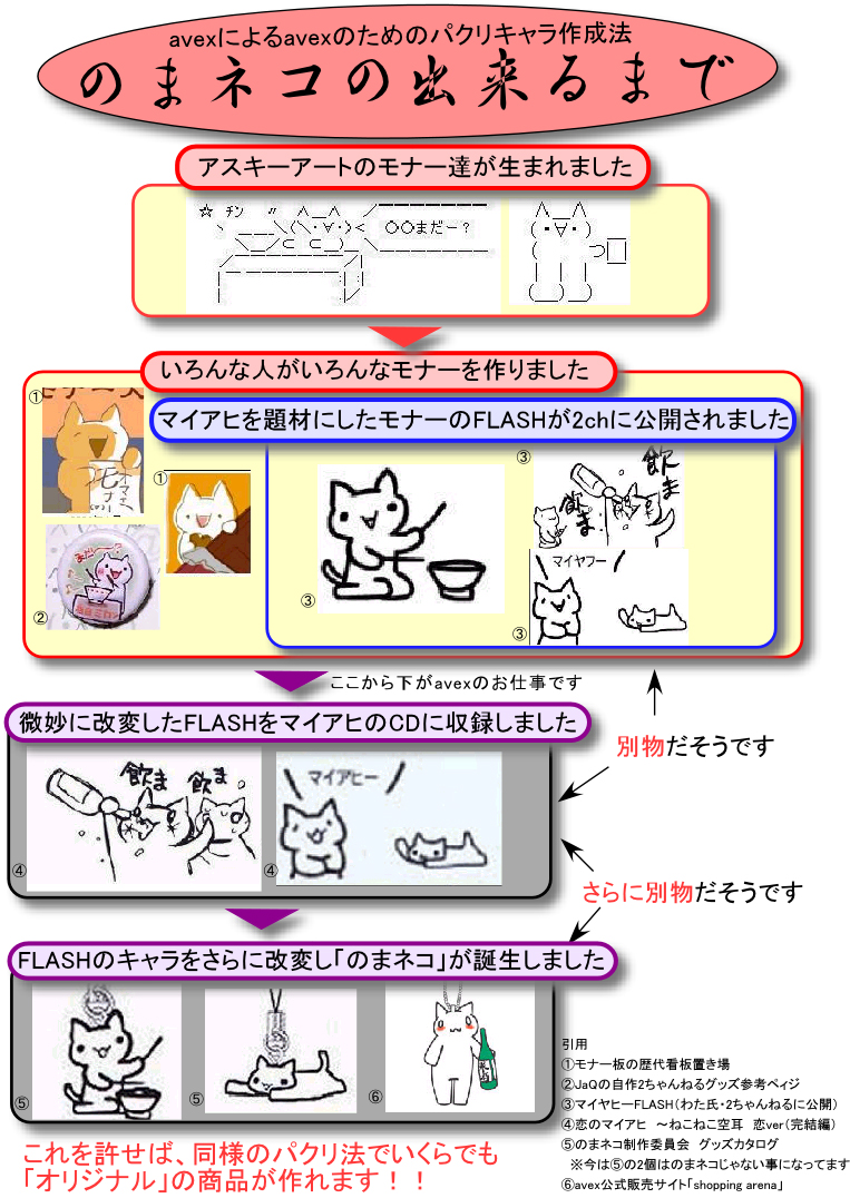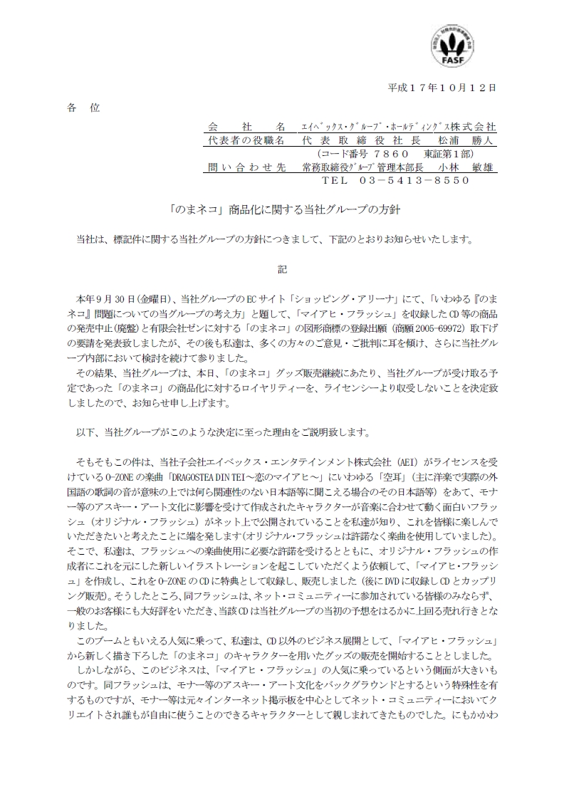 エイベックス・グループ・ホールディングス株式会社(以下、エイベックス)が2005年10月12日付けでプレスリリース「『のまネコ』商品化に関する当社グループの方針(PDF)」を同社ウェブサイトに掲載しました。(テキスト)