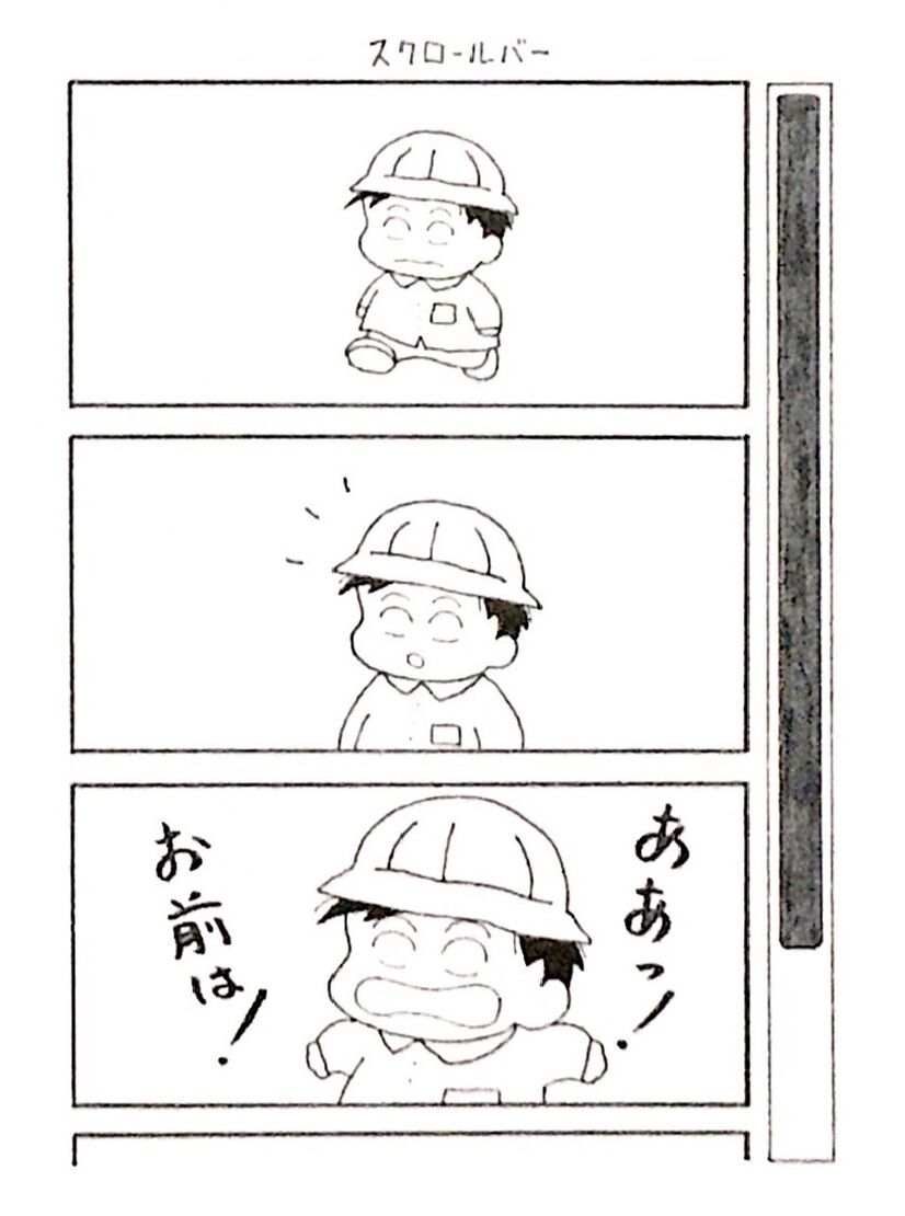 諸悪の根源はわかりにくい漫画を描いたワタシなのです/「す」で始まる漫画の依頼に「スクロールバー」という漫画を描きました/掲載先で意図を読み取って貰えず右のバーと四コマ目の枠を消して掲載されてしまいました/これじゃもうなんなのかわからないに決まってますね高知漫画集団さんどうもすみませんでした/キッチンハイターの匂いが指からとれません