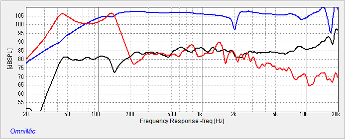 スピーカーユニットの軸上(黒線)と第2ダクト開口部(赤線)に近接させてOmniMic測定した結果は以下のグラフです。