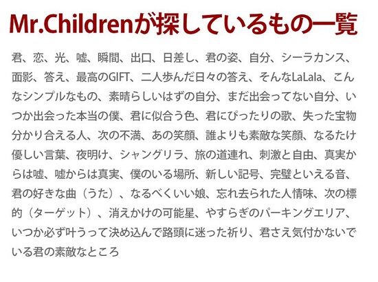 【画像】ミスチルが探してるモノ一覧 2025年12月15日 06:00 一覧 くるみ @k7881001956379見つけた瞬間思わず吹き出してしまった December 3, 2025 みりんご🍎 @poco_onlineミスチル、ちゃんと寝れてるのかな不安でしょうがないでしょうDecember 4, 2025 こぎけつ。 @TPjYlyDDSV54894で、どれか見つかったの?December 3, 2025 GB-holic @gb_holic探すのをやめたら見つかるのはよくあるハナシやでDecember 3, 2025 minato-セツナワールド @setuna_worldなにを探しているのかすらわからないのが井上陽水、、December 4, 2025 Oldman's rooster @omarco_marco槇原敬之が気づいたこと一覧も見たいですDecember 4, 2025 うめきち(umekiti yuu) @umekitiyuuシーラカンスが気になる…December 3, 2025 コロ柴 @shiba36koroL'Arc-en-Cielに降り注いだもの一覧もあるDecember 4, 2025 ばるたん(めがね) @tabolow01ビジュアル系バンドが切り裂いたもの一覧も見たいですDecember 4, 2025 SN-無職になりたいアクアリウム @notigeruniverseこれだけ探し物があるのに、他の人にありがちな「愛」は探していないのが桜井さんのセンスなのだろう。ちなみに私が好きな曲は、ありふれたラブストーリーです。December 3, 2025やっぱ何曲も作ってると作詞にクセが出ちゃうんだろうな。 おすすめ < 前の記事次の記事 > コメント コメント一覧 (22) 1. 名無しさん 2025年12月15日 06:42 愛があるから探してるわけだからな 0 qmanews がしました 2. 名無しさん 2025年12月15日 06:43 くま向けのワードに見えそうなのがちらほら 0 qmanews がしました 9. 名無しさん 2025年12月15日 08:32 >>2 だいたい脳内意味深くまフィルタを通すとそれっぽく見えてくるから、まあ多少はね? ただ「次の標的(ターゲット)」はガチ 0 qmanews がしました 20. 名無しさん 2025年12月15日 21:19 >>9 ミスチル「獲物がいたぜ」 0 qmanews がしました 3. 名無しさん 2025年12月15日 07:14 おもろい 0 qmanews がしました 4. 名無しさん 2025年12月15日 07:40 カラオケでミスチル歌うと若い子から「古い」とか「知らない」とか言われる時代が来るとは思わなかったよ 0 qmanews がしました 5. 名無しさん 2025年12月15日 07:45 あの笑顔、は見つけてほしい 0 qmanews がしました 6. 名無しさん 2025年12月15日 08:19 それより僕と踊りませんか 0 qmanews がしました 7. 名無しさん 2025年12月15日 08:27 探して見付けられた物はあるのかい? 0 qmanews がしました 8. 名無しさん 2025年12月15日 08:28 桜井さんの代わりにLOVE SONGは探しておいてあげるね 0 qmanews がしました 10. 名無しさん 2025年12月15日 09:16 1973年に発表された、 井上陽水「夢の中へ」の洗礼を受けた結果だな。 0 qmanews がしました 17. 名無しさん 2025年12月15日 12:28 >>10 アニメのEDにもなったよな 0 qmanews がしました 22. 名無しさん 2025年12月16日 00:29 >>10 アレ2番が微妙に重くてほんと何探してるんだと思った 休むことも許されず、笑うことは止められて、這いつくばって探してるとか 0 qmanews がしました 11. 名無しさん 2025年12月15日 09:32 シーラカンス…? 0 qmanews がしました 13. 名無しさん 2025年12月15日 10:06 >>11 シーラカンスって曲がある 0 qmanews がしました 14. くま 2025年12月15日 10:25 >>11 深海ってアルバムの中にある 名盤ですよ 0 qmanews がしました 12. 名無しさん 2025年12月15日 09:40 見つけたもの一覧も作れそう 0 qmanews がしました 15. 名無しさん 2025年12月15日 10:27 槇原敬之が捨てたがってる物とかも やってほしい 0 qmanews がしました 16. 名無しさん 2025年12月15日 10:34 マキシマム ザ ホルモンの意味が解らない日本語の一覧キボンヌ 0 qmanews がしました 18. 名無しさん 2025年12月15日 14:41 昔、JPOPは「何か」を探されすぎみたいな感じのスレみたことあるな 0 qmanews がしました 21. 名無しさん 2025年12月15日 21:49 >>18 https://www.nicovideo.jp/watch/sm11334087 こいつの元スレやな 0 qmanews がしました 19. 名無しさん 2025年12月15日 16:26 小田和正を聞いた友人が『風ばっか吹いてる』ゆうてたな クセってあるんだな 0 qmanews がしました コメントフォーム 名前 コメント 記事の評価 リセット リセット 顔 星 情報を記憶 コメントを投稿する