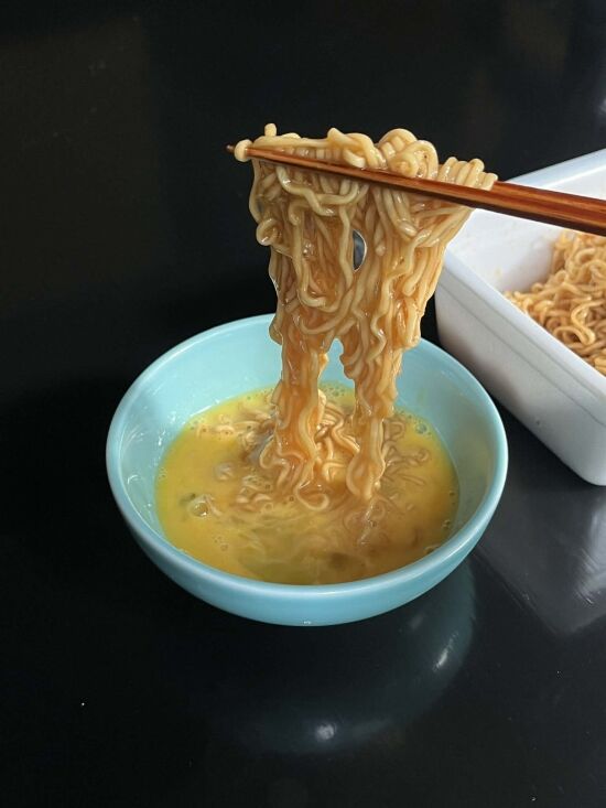 ① ペヤング(約90℃)を常温の溶き卵にくぐらせることで、麺の表面温度が瞬時に約60℃まで低下。