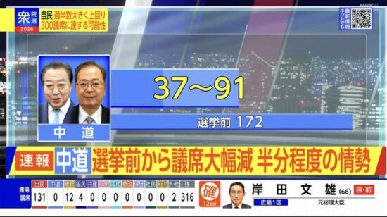 【選挙速報】開票速報、中道改革連合、壊滅へ