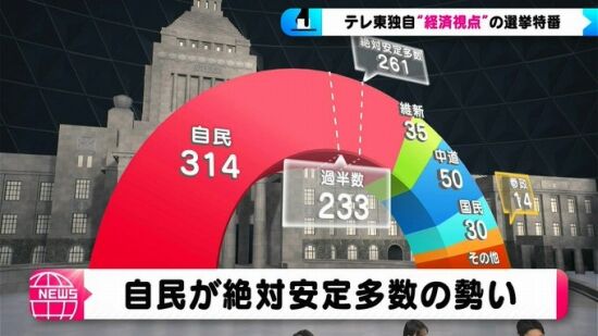 >【選挙速報】開票速報、自民党、絶対安定多数