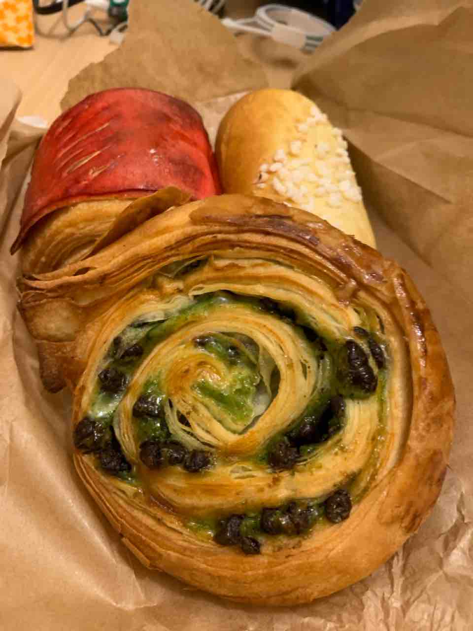 とりあえず、クロワッサンとサンドイッチとピスタチオのケーキパンと買ってみた