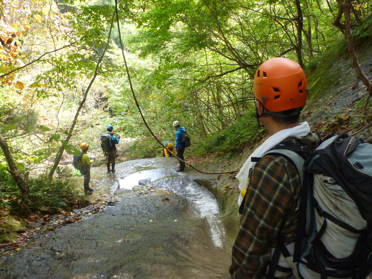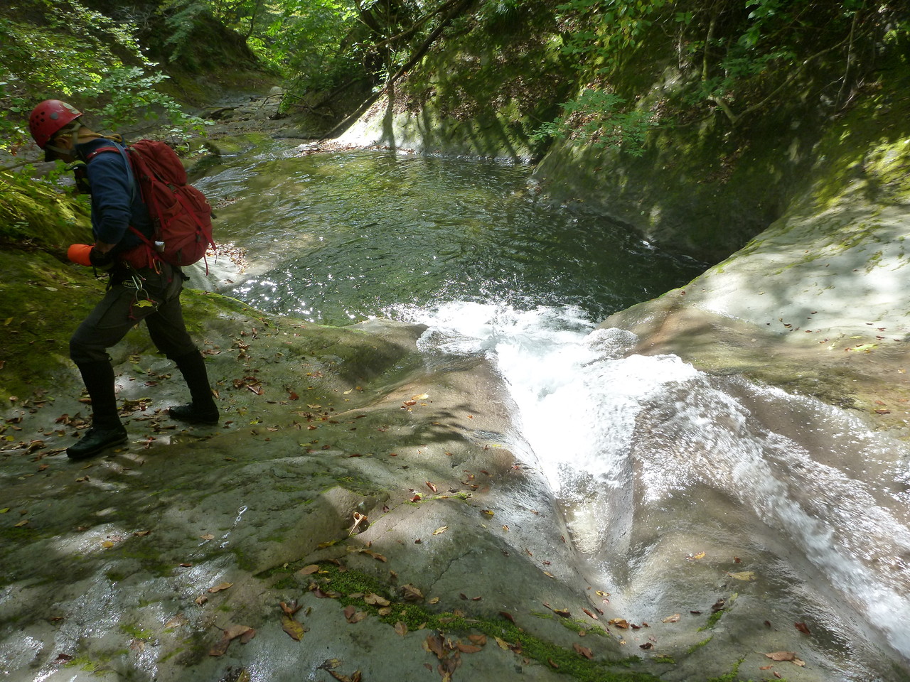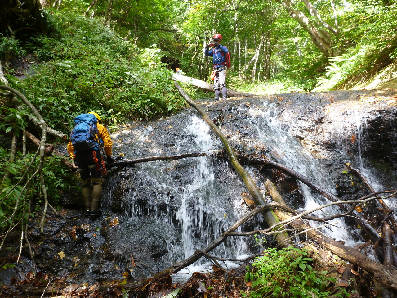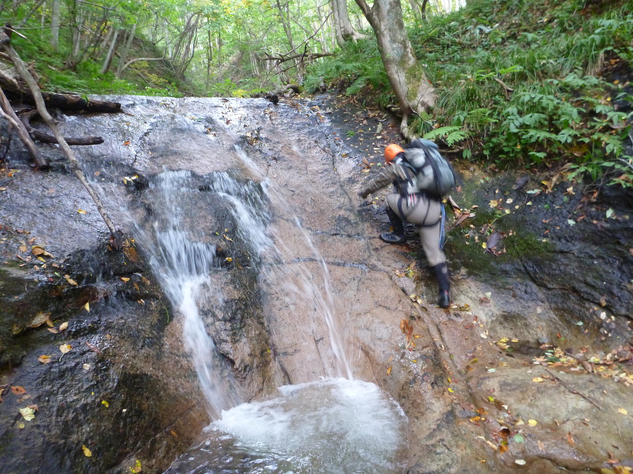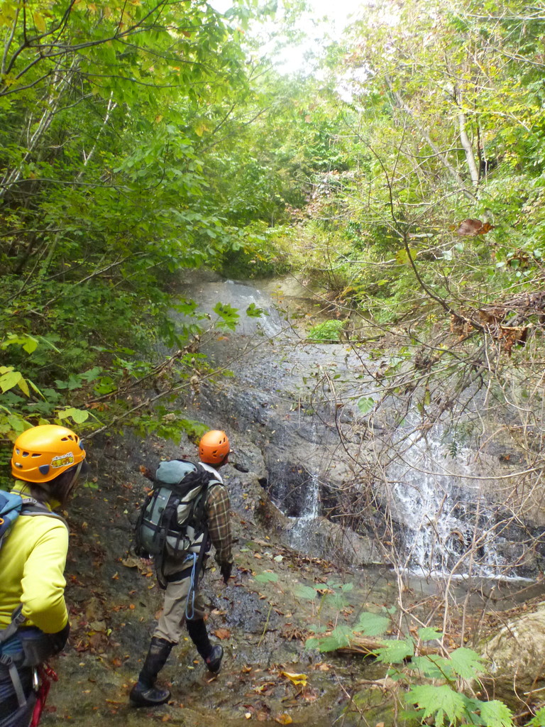 吐道沢の出合で少し大きめのナメ滝にぶつかって、ここで下降終了。