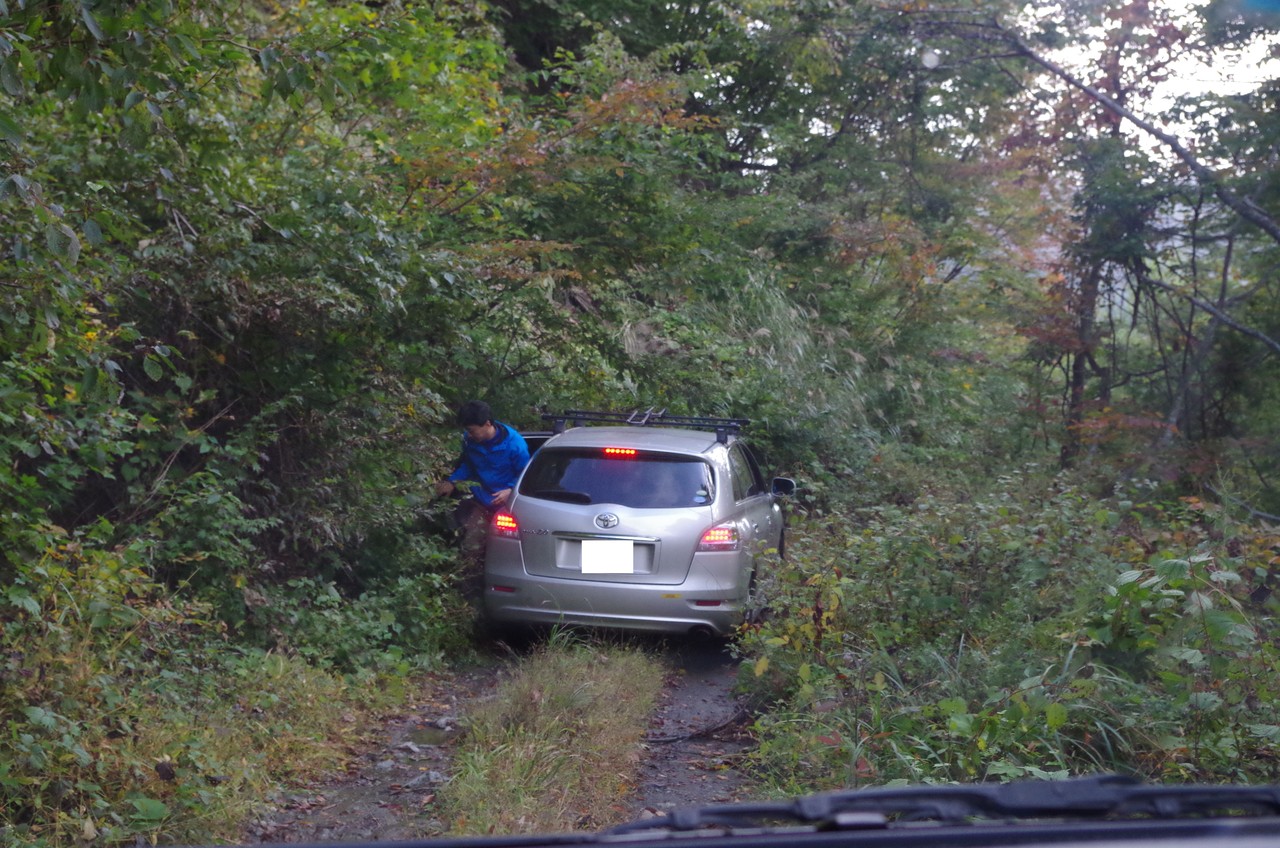 フラットダートの林道を進むが、途中乗用車では突破できそうにない障害があり、少しバックして林道脇の駐車スペースに2台デポする。