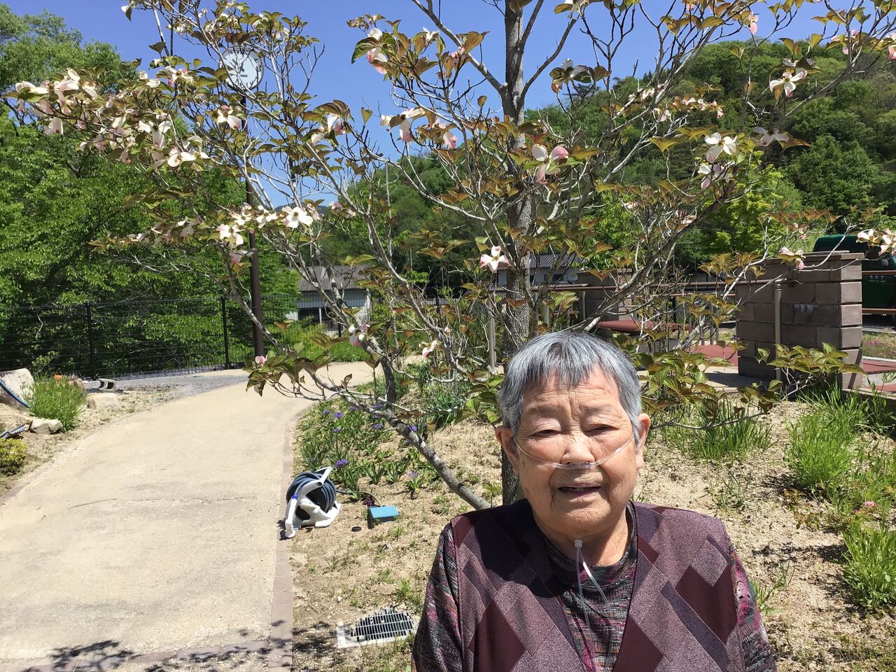 お散歩中、お庭にてハナミズキが咲いて記念写真!