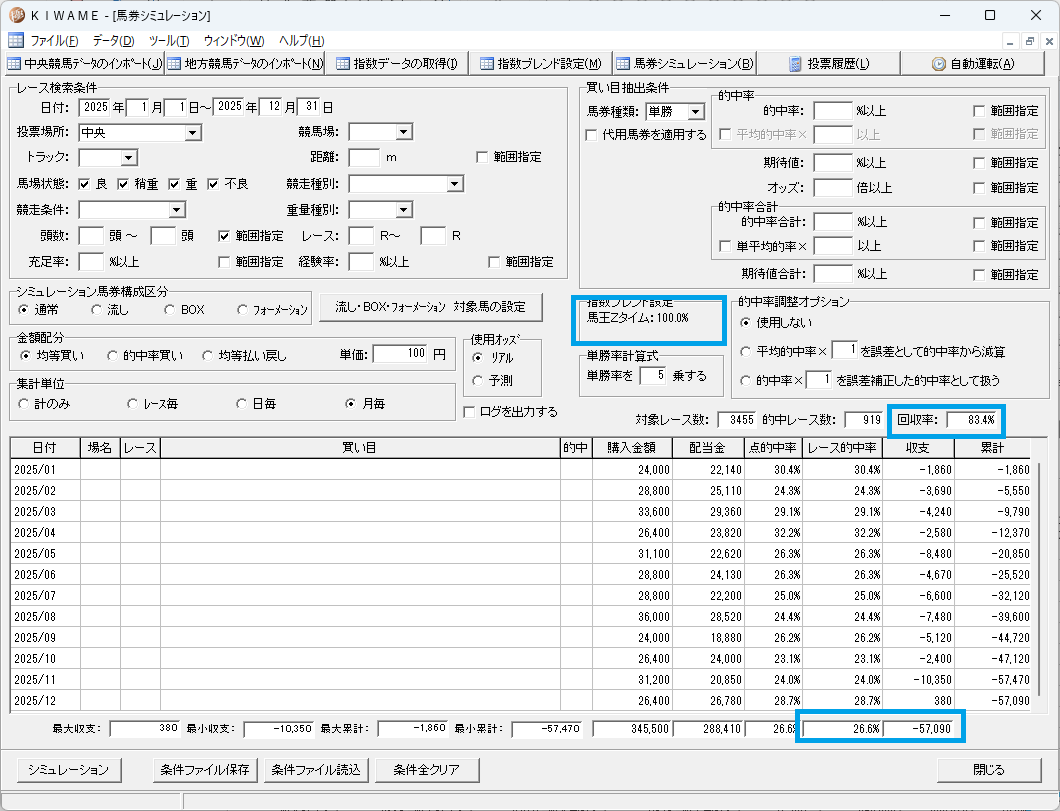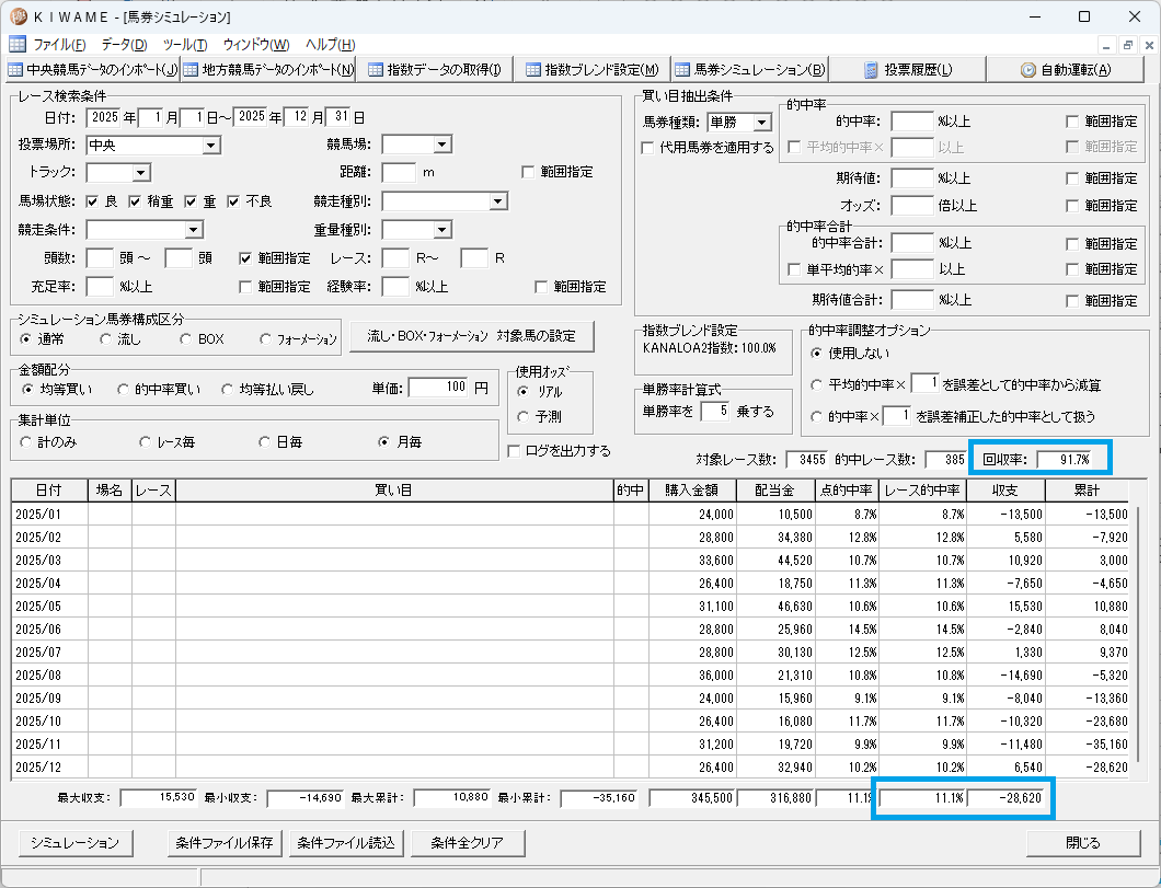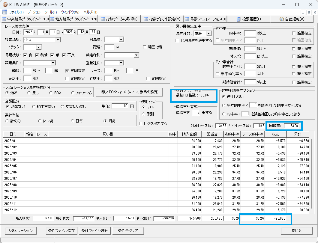 精度の高い指数で予想することが、競馬の勝ちに近づくことは間違いありません。2025年に実際にレース前に発表された指数の精度を検証してみたいと思います。検証方法は中央競馬全レースの指数1位馬を100円づつ買った時の的中率と回収率で評価します。勿論、もっとも的中率が高くて回収率が高い指数が良い指数と言うことになります。検証ソフトは各指数をダウンロードしてシミレーションや自動購入が出来る「KIWAME」を使用します。