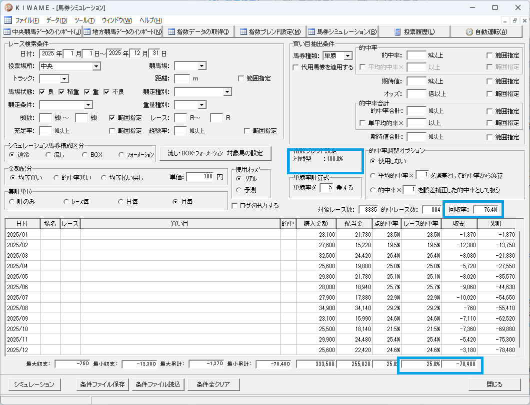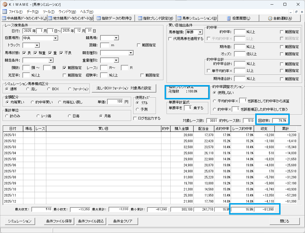 中央競馬2025年の指数1位馬の単勝を買い続けた検証結果まとめは以下の通りです。