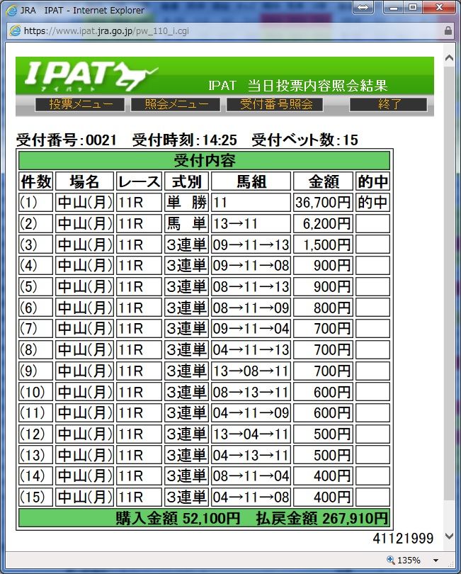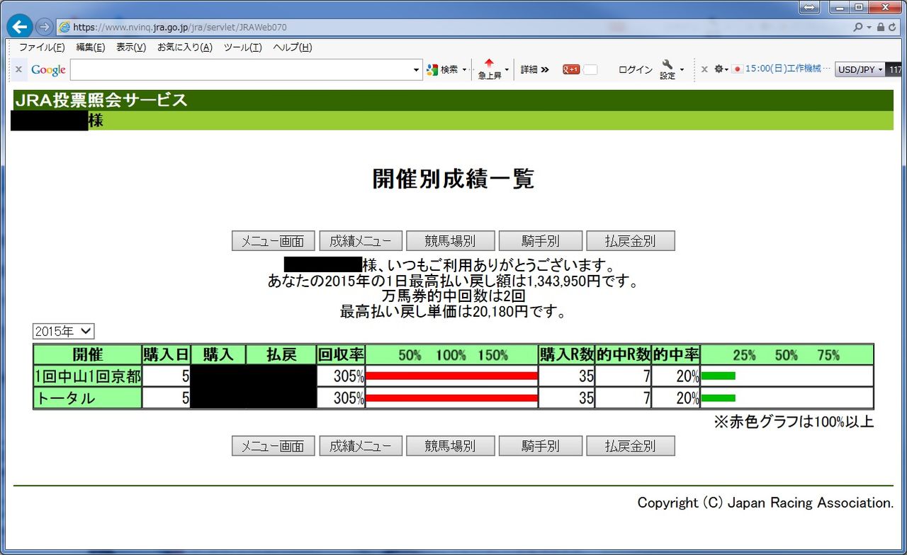次に面白いデータ見れますので是非見て頂きたいのですが、ユーザ参加型競馬予想サイトである「ウマニティ」で「予想コロシアム」→「大会情報」→「通算」と押すと「ウマニティ」に参加している自称馬券名人の回収率を見ることが出来ます。1000R以上予想している参加者数は2015年1月29日時点で3977人で「回収率」をクリックしてでソートすると回収率110%以上は僅か36人で1%未満です。1発の特大ホームランだけでまだプラスの人、近年は毎年マイナス収支で過去の栄光だけでプラスの人を除くと残念ながら回収率110%以上の人はほとんどいなくなってしまいます。ここに馬券名人の現実があります。又、馬券で儲け続けると言うことはそれほど難しいことなのです。