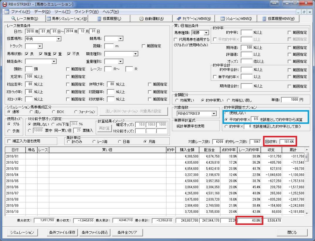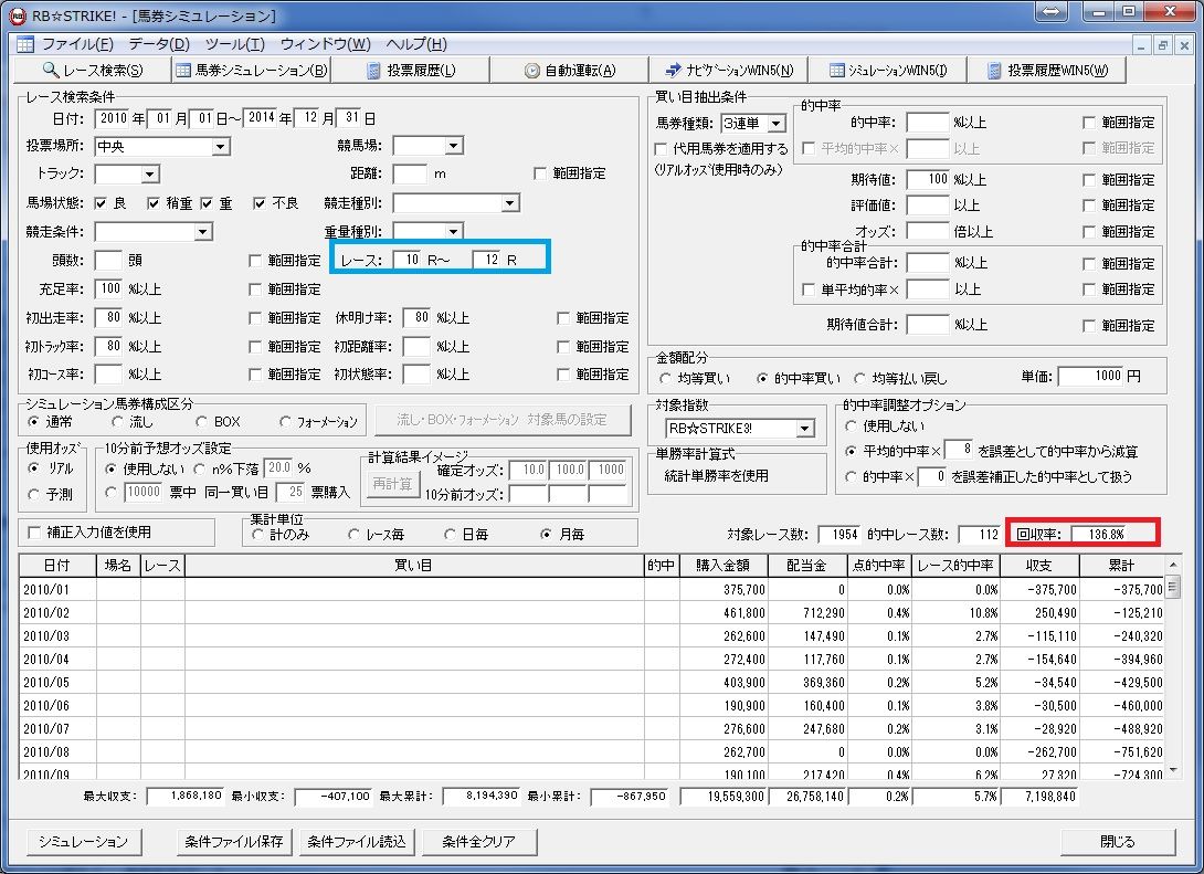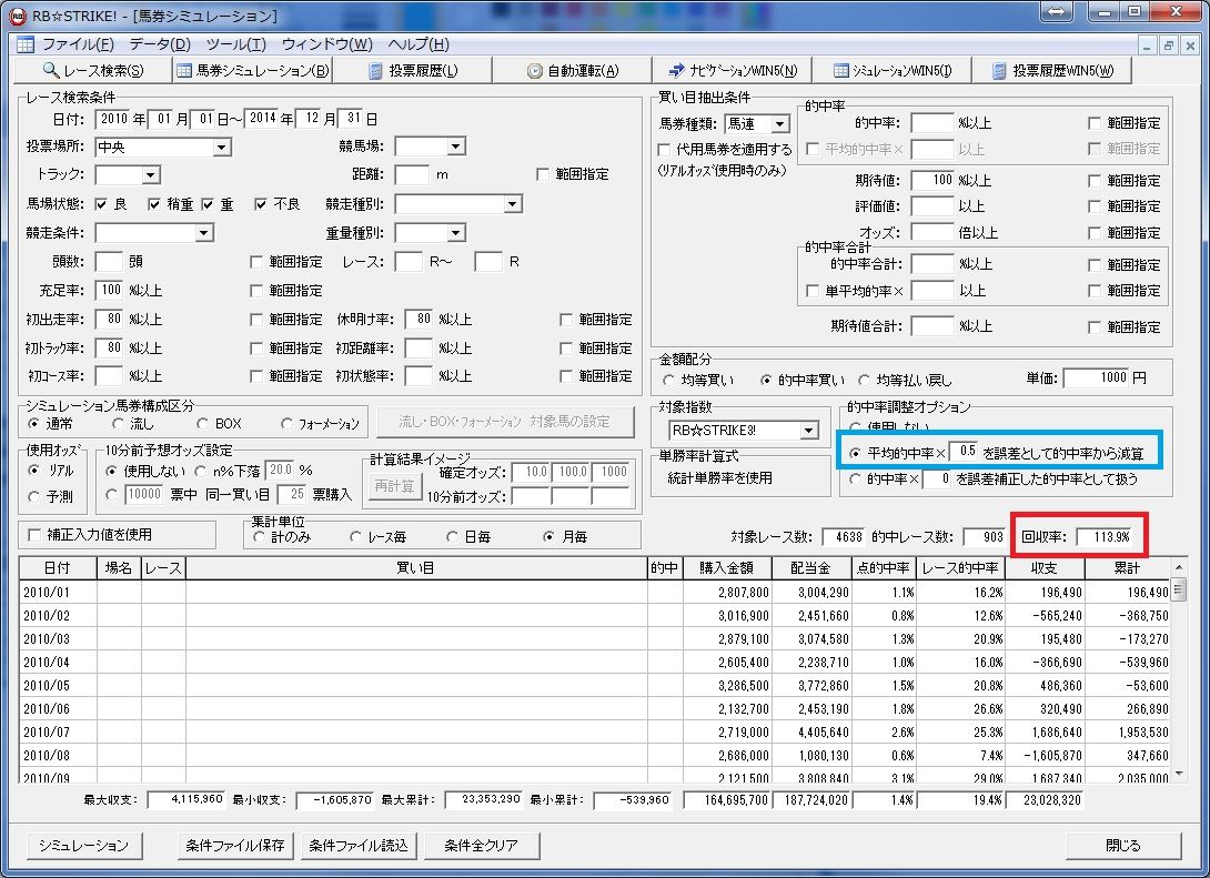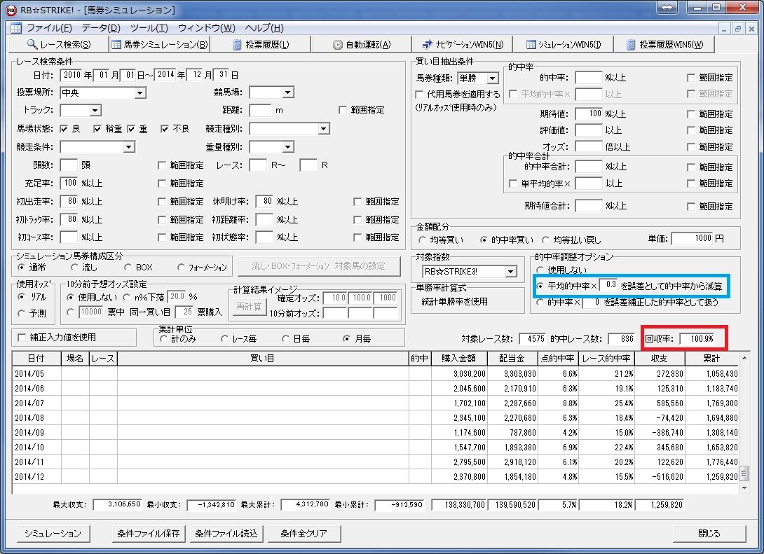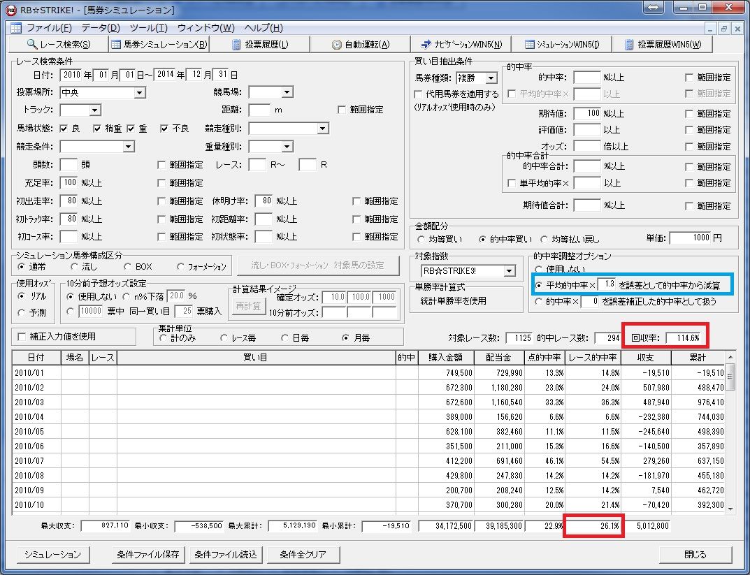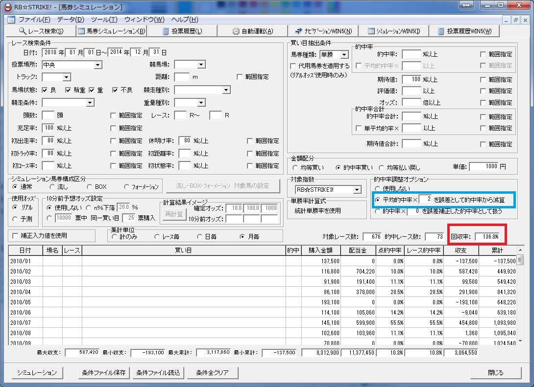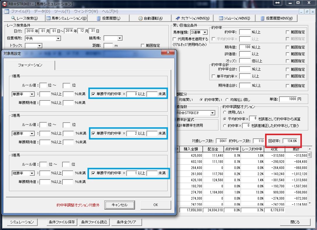 平均的中率の減算率を下げて行くと的中率が高くなって行きますが、逆に回収率は下がって行きます。的中率が高くて回収率も高い買い方がベストですが、残念ながら的中率と回収率は反比例な関係にあると言えます。そのことを考慮して自分の好みの購入エリアを見つけるしかありません。又、誰でもたくさんのレースに参加したいはずだと思います。ですからレースの絞り込み率の高いところから、充足率100%→90%→80%と徐々に下げながらシミュレーションするといいと思います。単勝以外の馬券種類では、控除率が変更された2014年6月以降と以前でシミュレーションしてみるのも重要です。