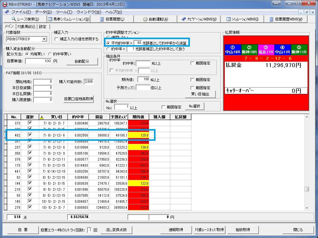 正確に近い指数のレースを選ぶ方法には良馬場時のレース、スローペースの無い短距離、トラックバイアスが少ないダート戦のみ、ヤリヤラズが少ない競馬場、ローカル開催以外の競馬場、降級時期以外などもありますが、ここでは充足率などの確率の高いレースのみで絞り込んで説明します。的中率の誤差については期待値200%以上の買い目のみ、フォーメーションによるクロス買い、的中率合計の高いレースなどで絞り込む方法もありますが、ここでは的中率から平均的中率×nを減算する方法で説明して行きます。馬券種類は控除率がほぼ一定でかつ20%と少ない単勝馬券で検証します。