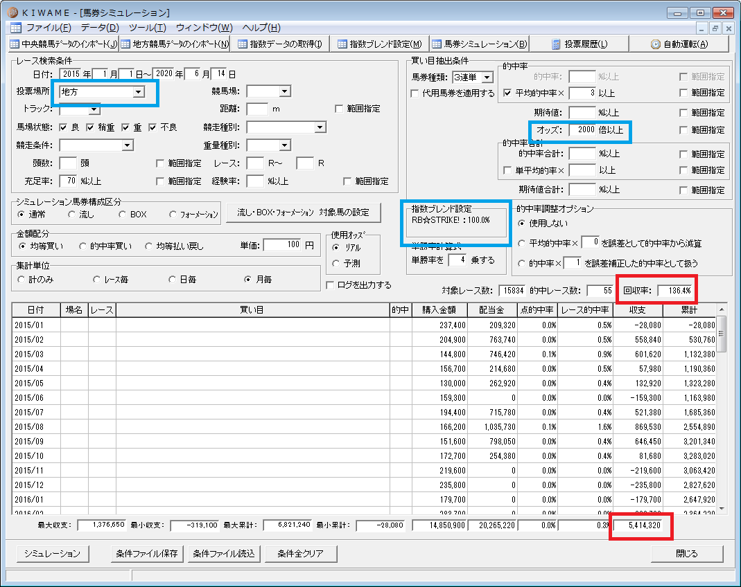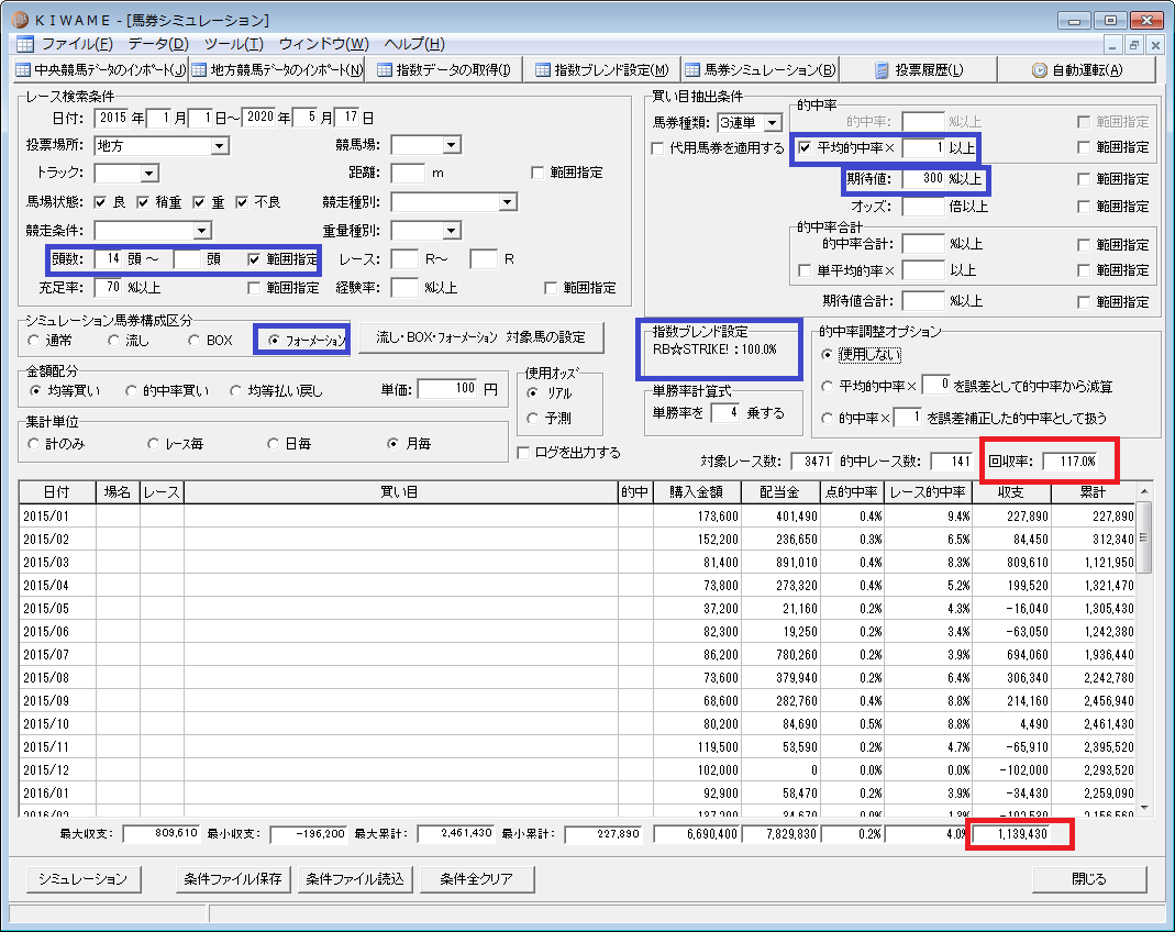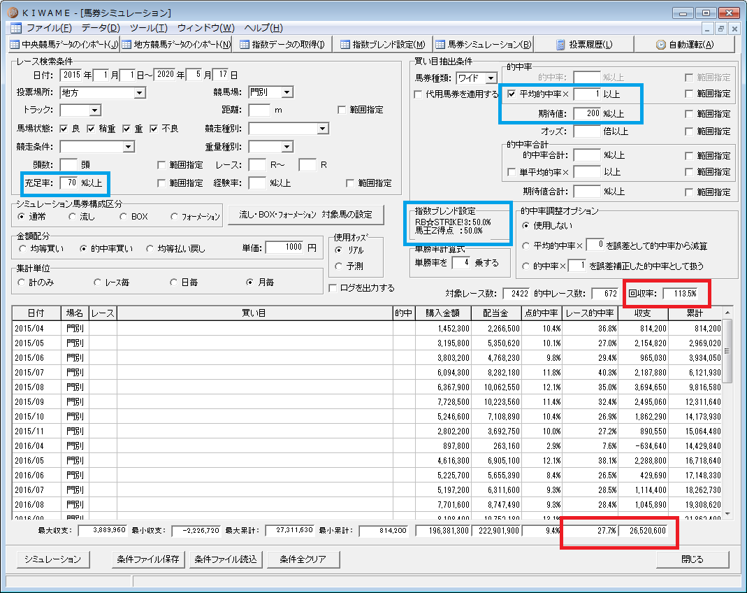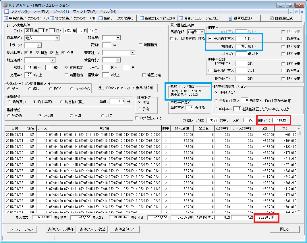 RB☆STRIKE!3(50%)+馬王Z得点(50%)、平均的中率×1以上、期待値200%以上、充足率70%以上