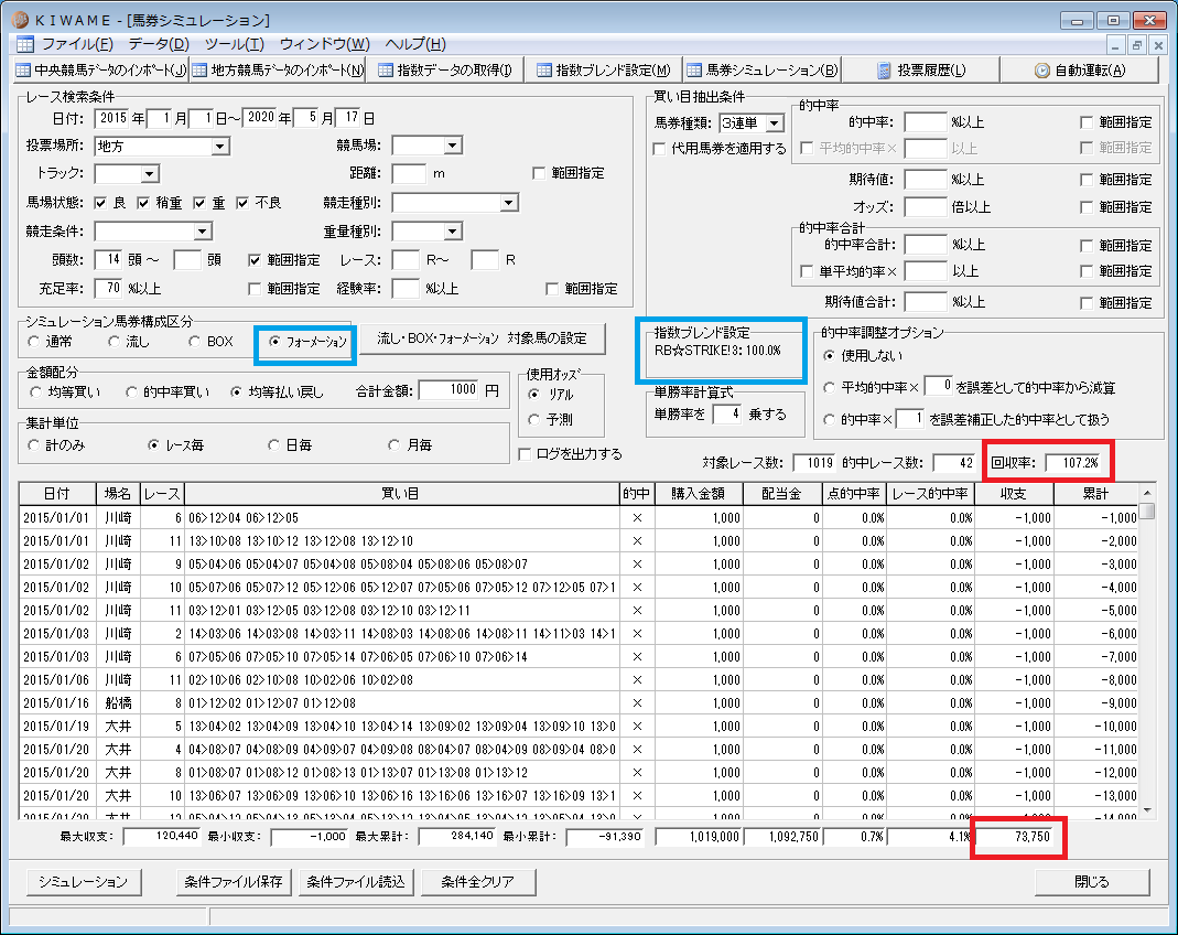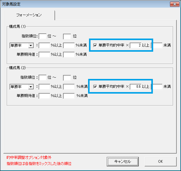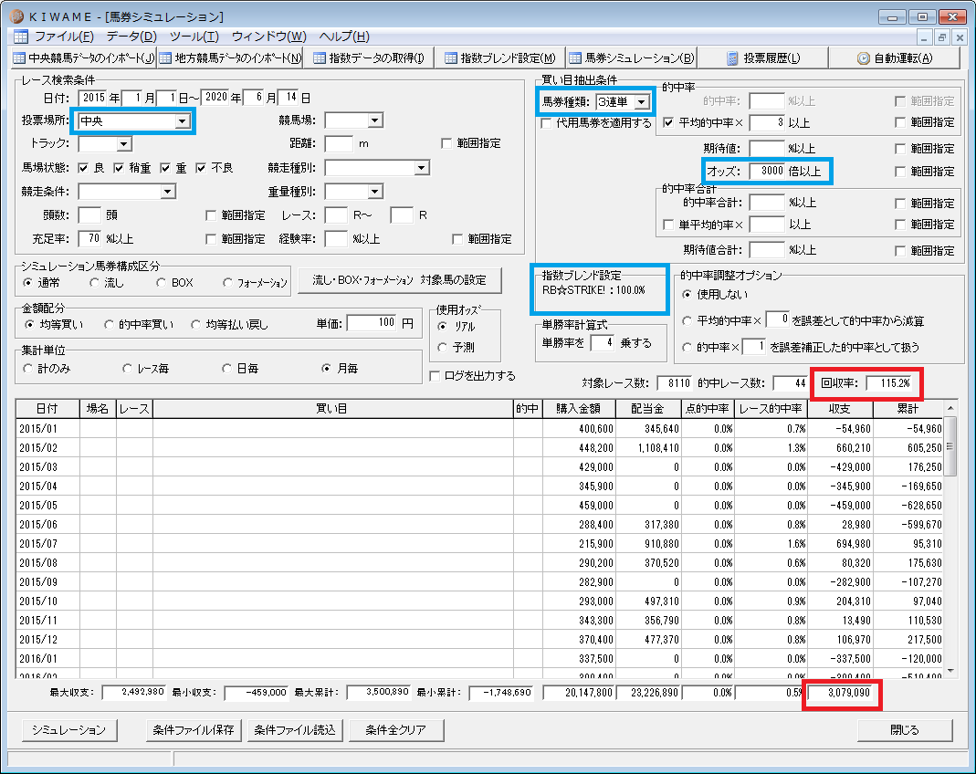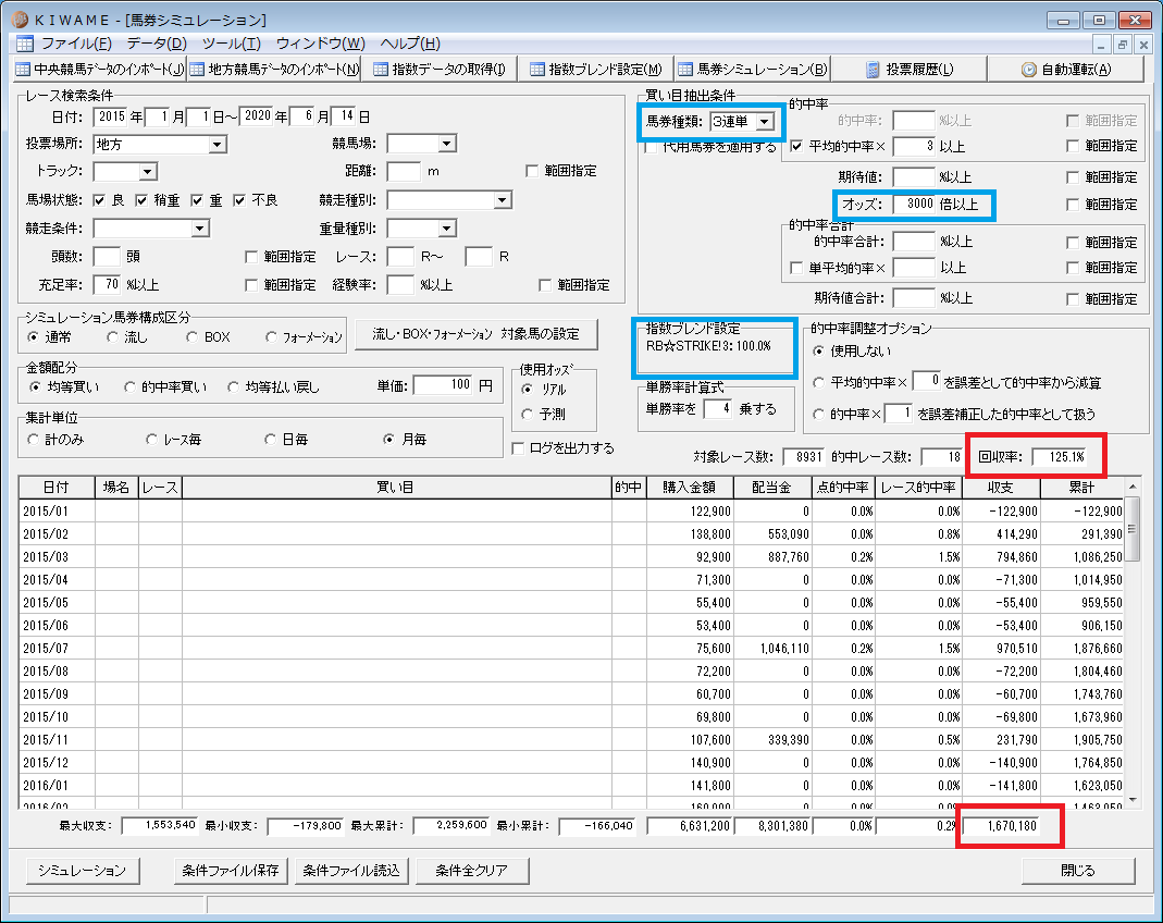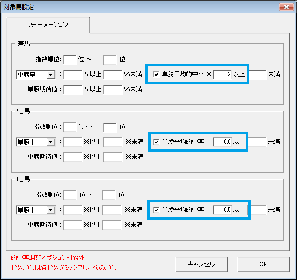 RB☆STRIKE!3(50%)+馬王Z得点(50%)、平均的中率×1以上、期待値200%以上、充足率70%以上