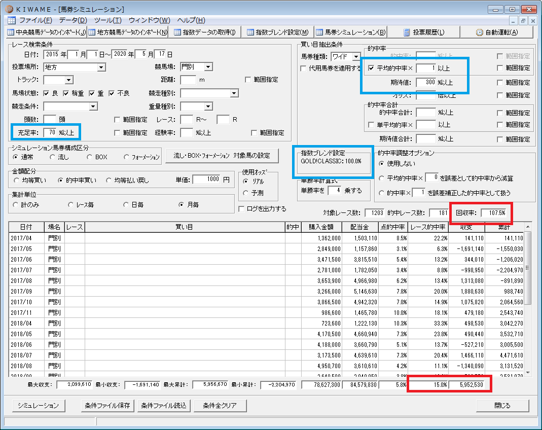 GOLDCLASSIC100%、平均的中率×1以上、期待値300%以上、充足率70%以上