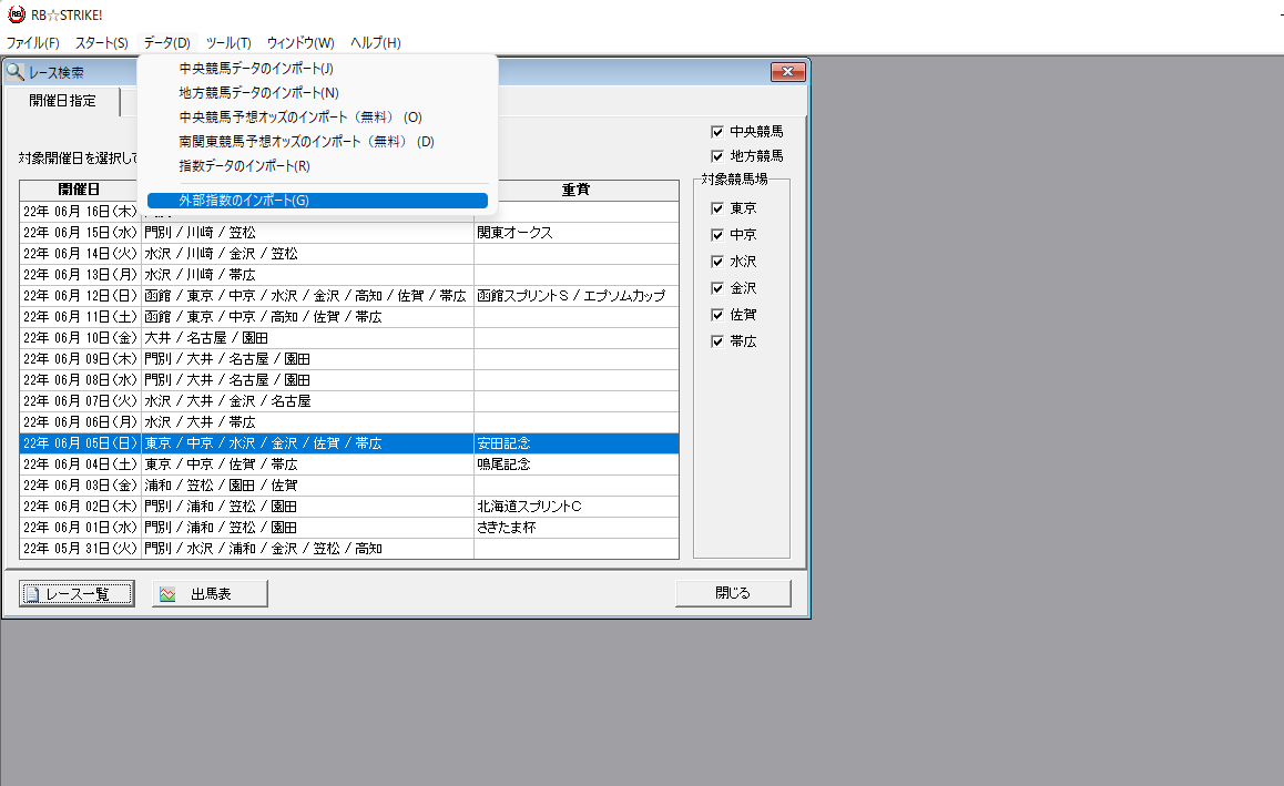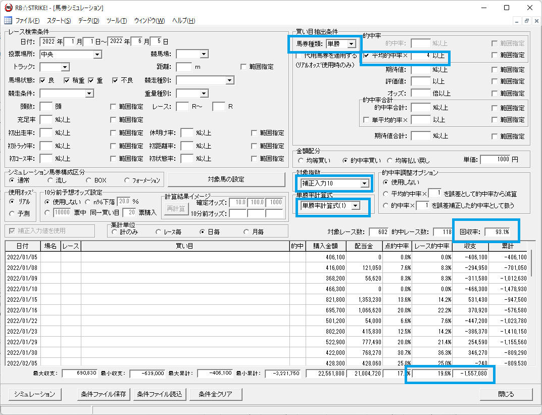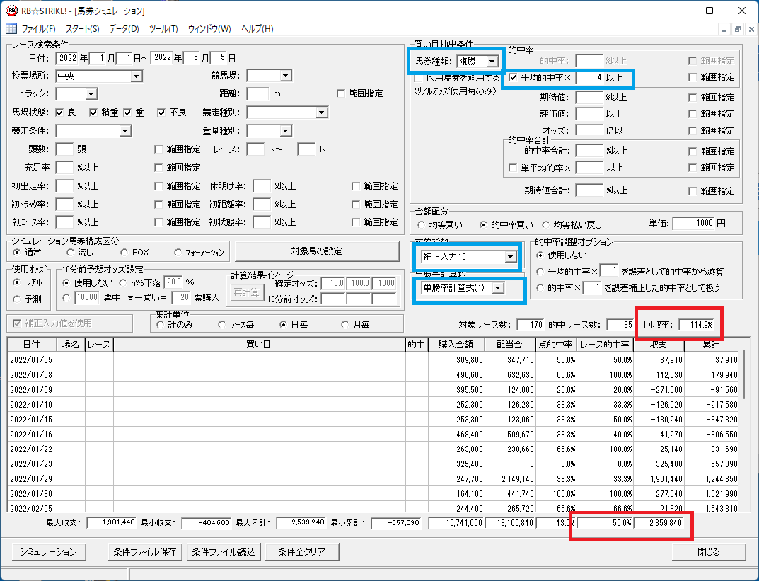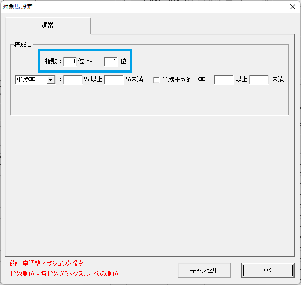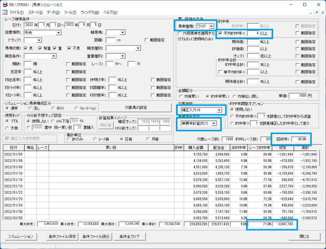 あと先週のブログの訂正ですが、RB☆STREKE!で指数1位馬の単勝を買い続けるシミレーションは出来ないと書きましたが、「出来ました」! 馬券種類を「単勝」にして「流し・BOX・フォーメーション 対象馬設定」を押して指数1位〜1位を指定します。