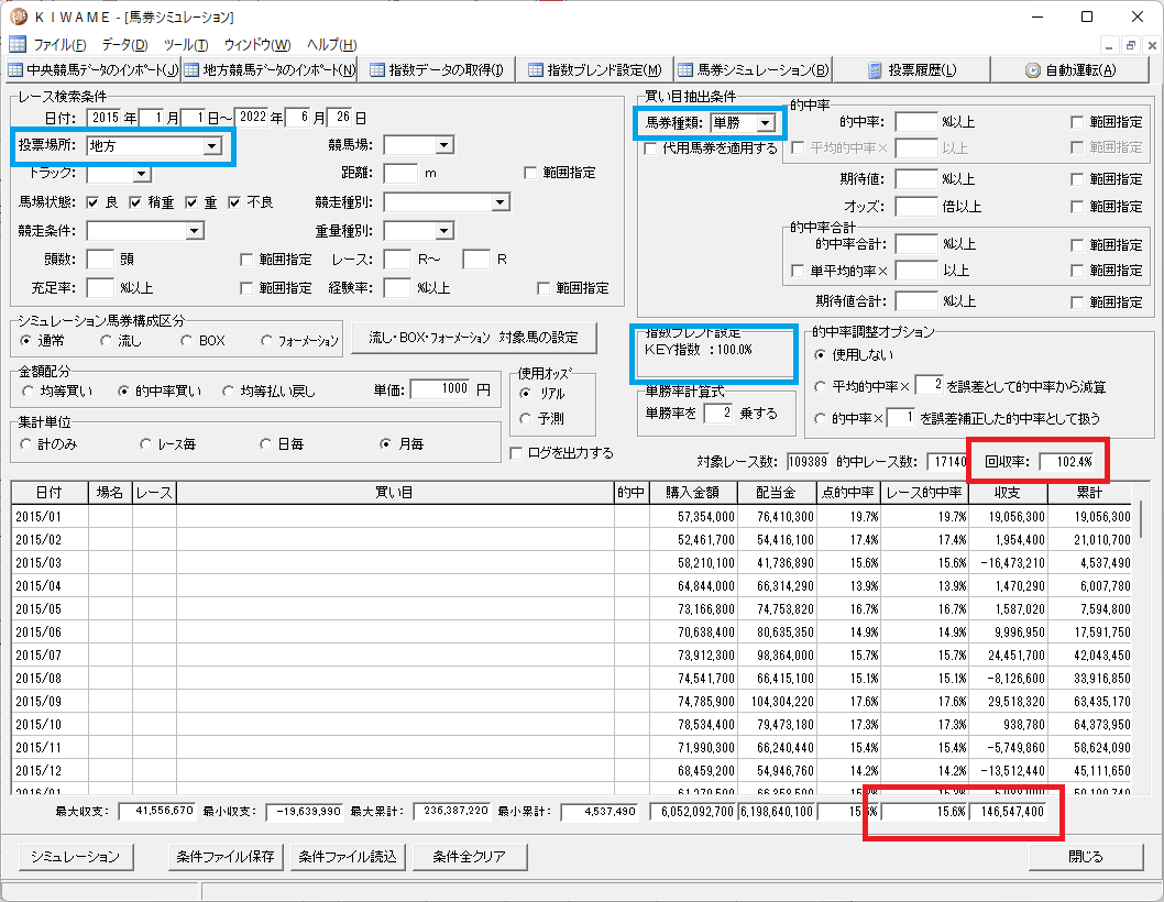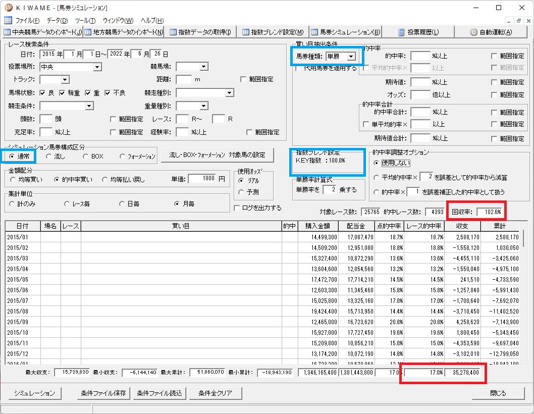 中央競馬の全レースで「KEY指数」1位馬の単勝を買い続けたシミレーションを行った結果は以下の通りです。
