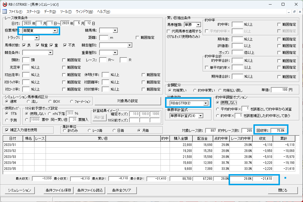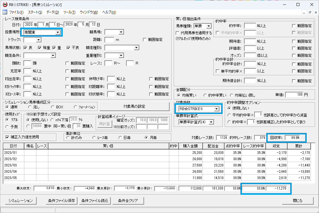 南関東のレースでRB☆STRIKE!3指数の1位馬の単勝を100円づつ買った場合