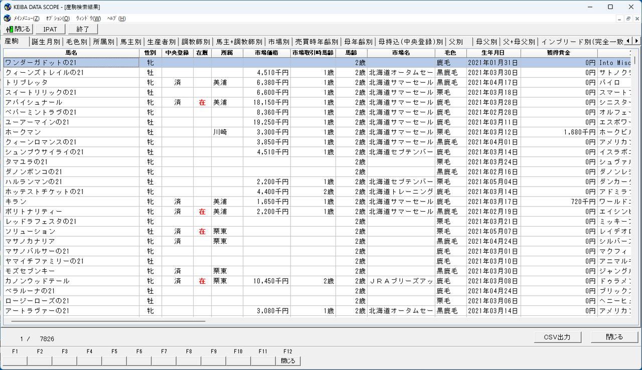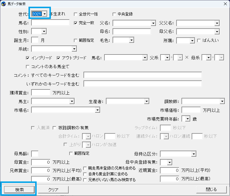 去年の2歳馬について調べるには「2020」年生まれを入力します。今年活躍している定義として獲得賞金1000万円以上とします。