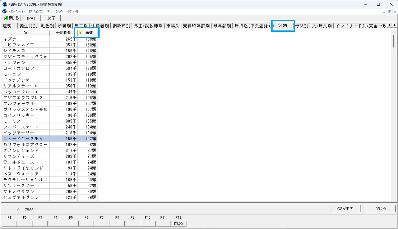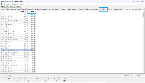 「父名」タブを押して、「平均賞金」タイトルをクリックすると賞金が多い順に集計されて表示されます。頭数が1頭の馬はデータ数的に信頼度が低いと考えます。頭数12頭のサトノクラウン産駒はいいですね。そのあと、ドラメンテ産駒、キタサンブラック産駒が続きます。