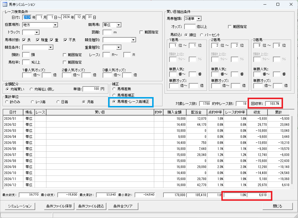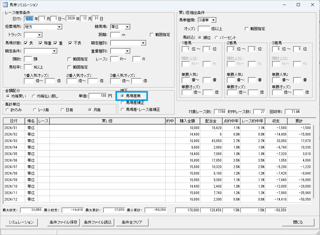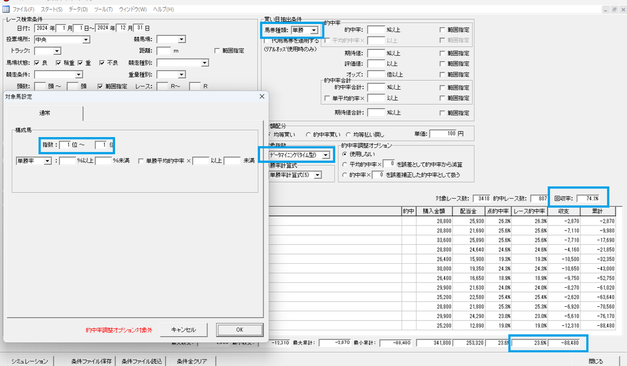 一番最初に思いつく買い方は、1番人気で単勝2倍以上の馬をマーチンゲール(外れたら倍賭け)で買う方法ですが、1番人気が単勝2倍未満のレースが多く購入レースが少ないのが現状です。