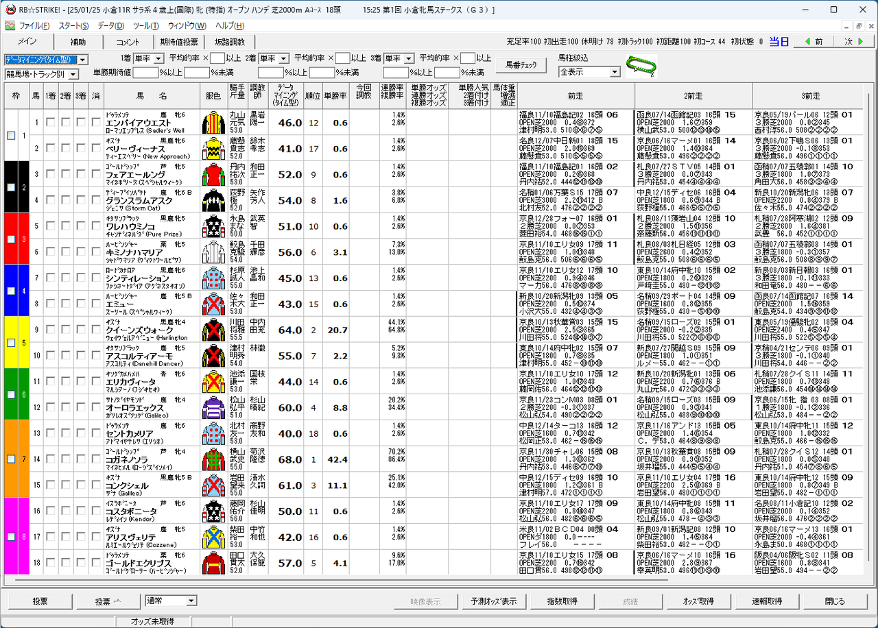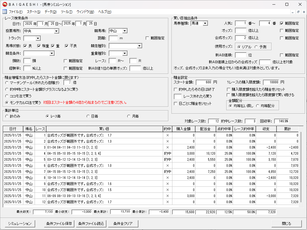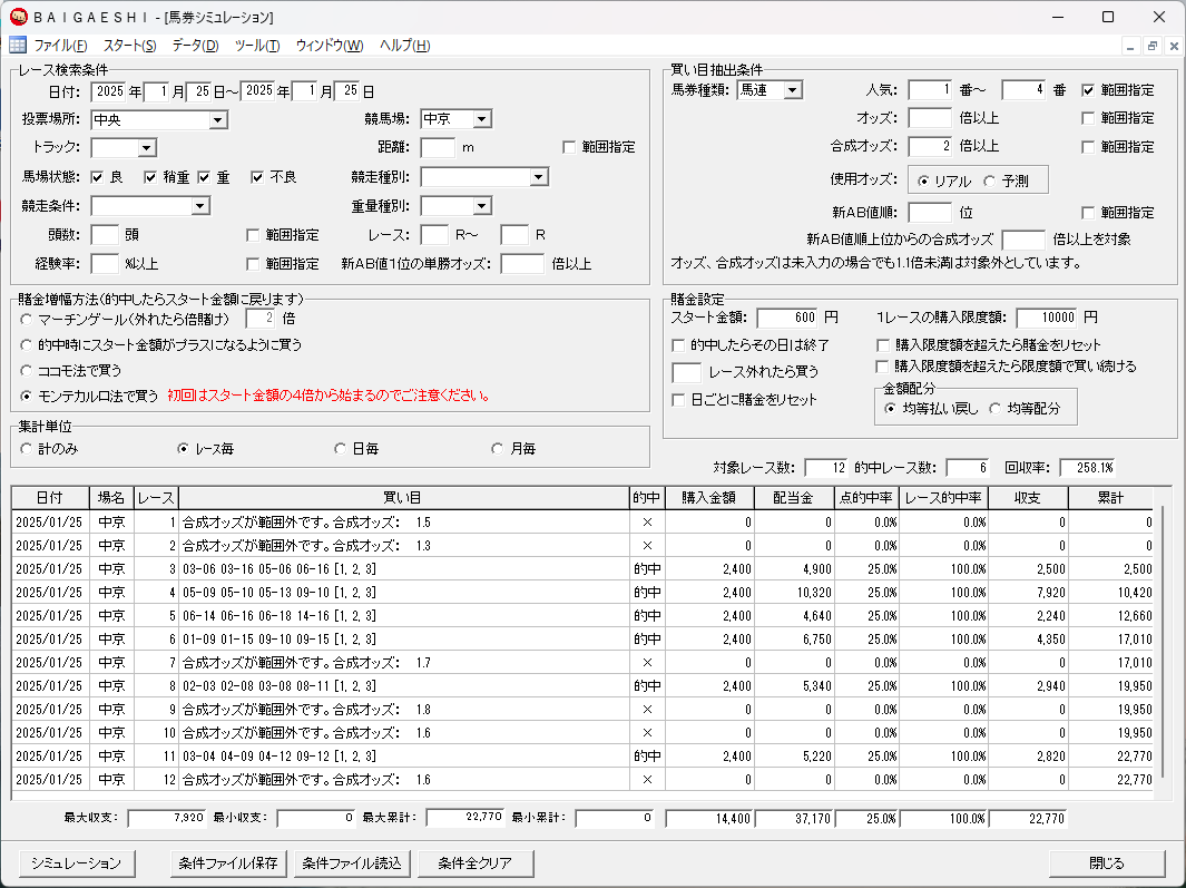 そこでお勧めなのが、馬連1番人気〜4番人気の合成オッズが4倍以上の時だけモンテカルロ法で買う方法です。BAIGAESHIは競馬場指定が必須です。競馬場間で買うと次のレースまでに払い戻しが間に合わない可能性があるからです。