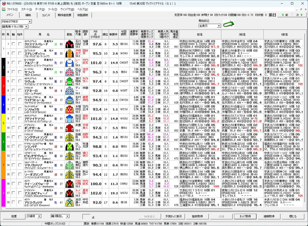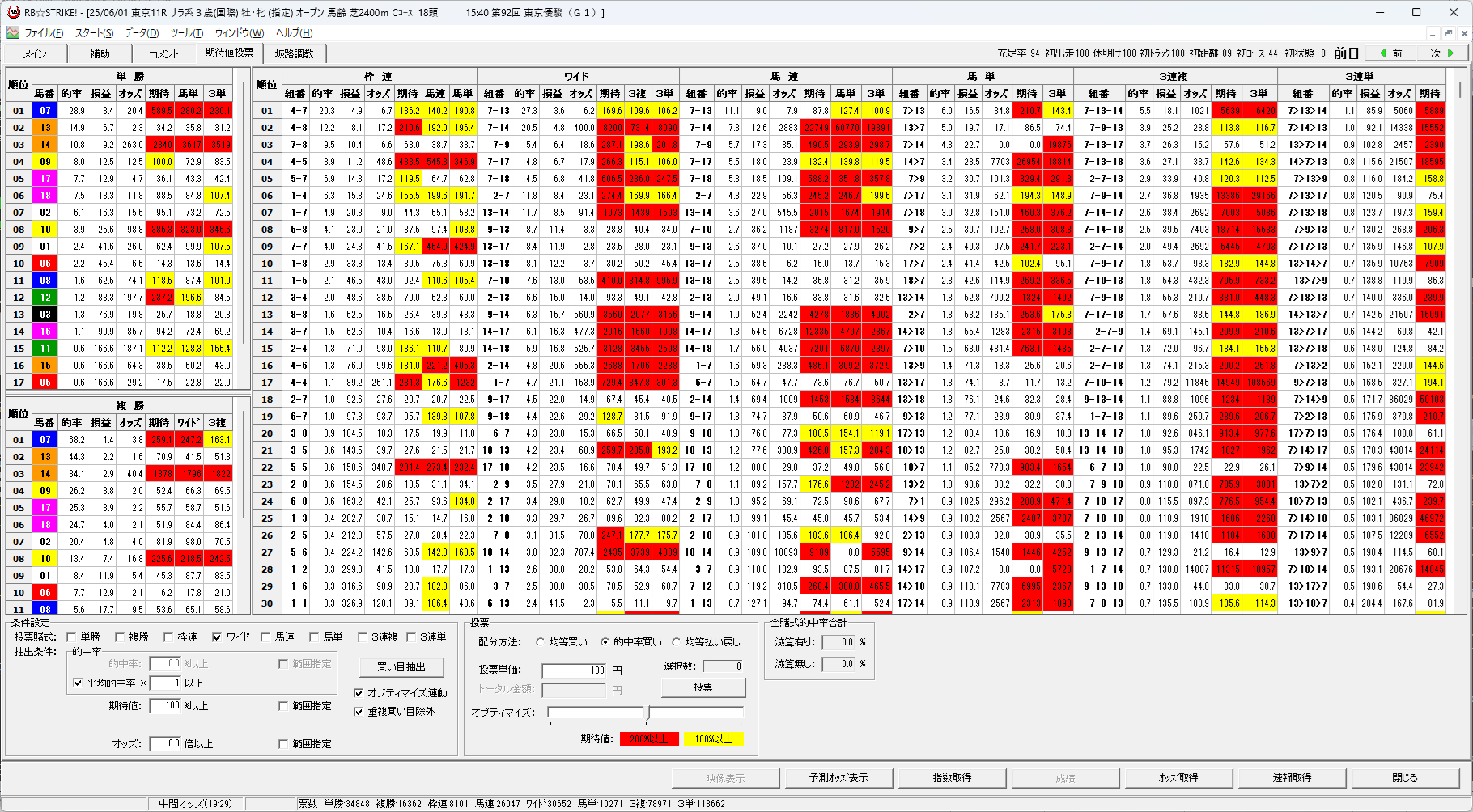 期待値画面とは期待値の高いすべての買い目を表示する画面です。真っ赤の買い目が期待値が高い買い目で黄色がやや期待値が高い買い目です。一発で買い目を選択して投票することも出来ます。RB☆STRIKE!はUMACA投票にも対応していますので税金面も安全です。