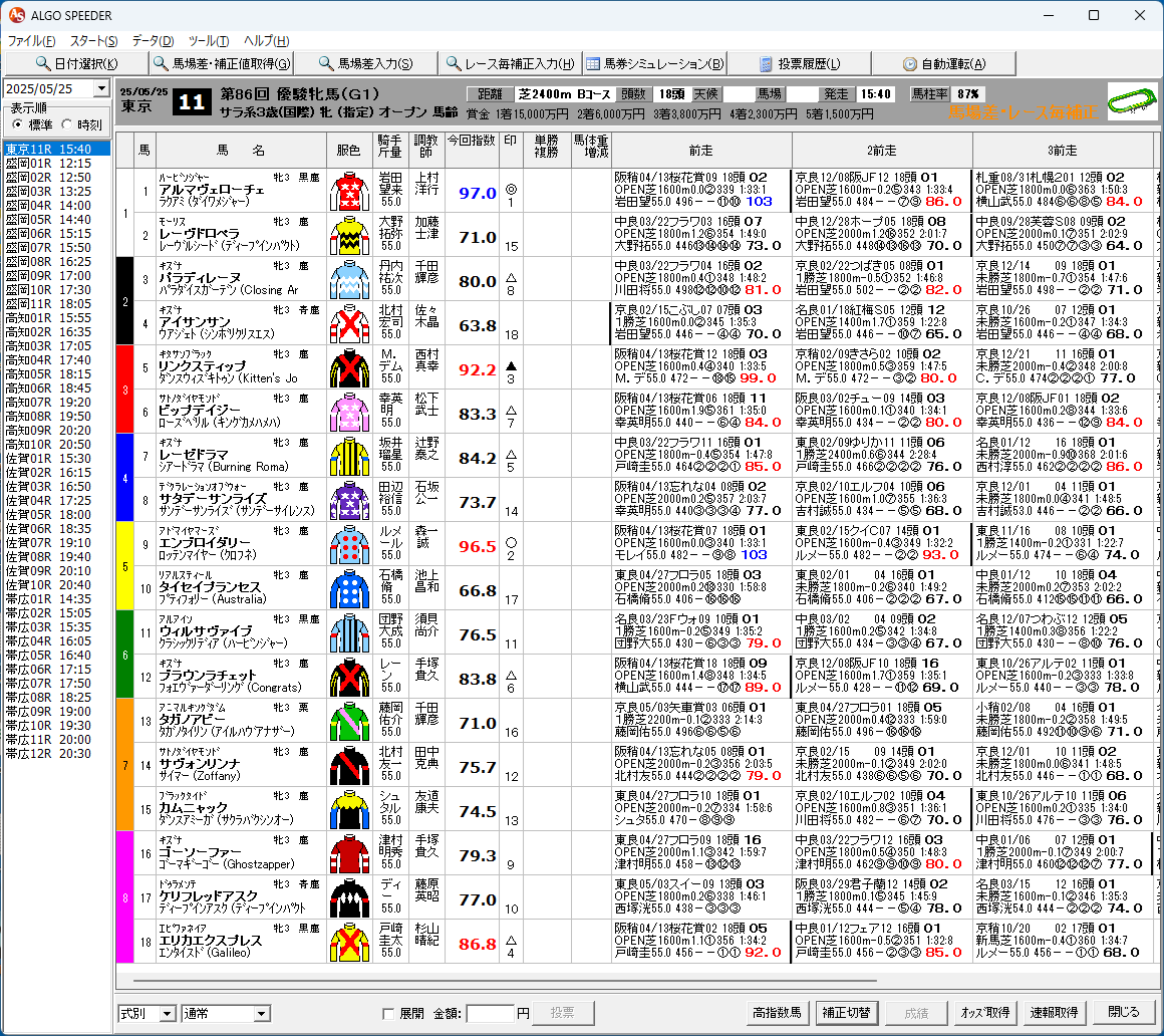 指数1位はミュージアムマイルの前走皐月賞の89.8です。驚くことに現在8番人気です。皐月賞馬がこのオッズで買えるのはかなりおいしいレースと言えます。指数2位はホウオウアートマンの前走89.8です。こちらはなんと現在18番人気です。大変厳しいローテーションですが、かなり期待値の高い1頭と言えます。