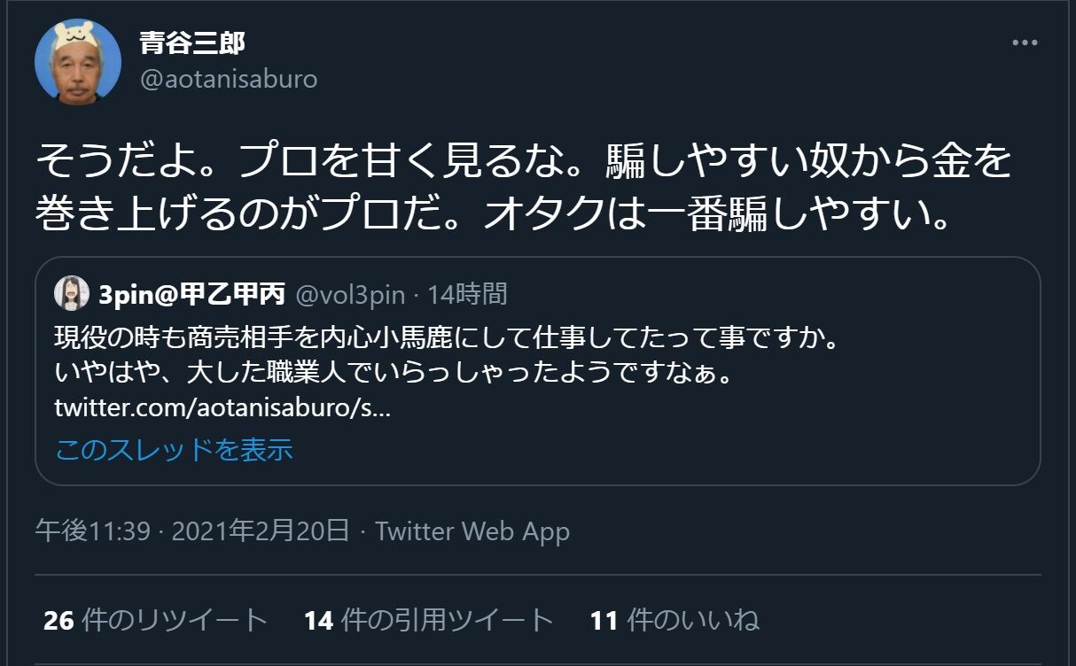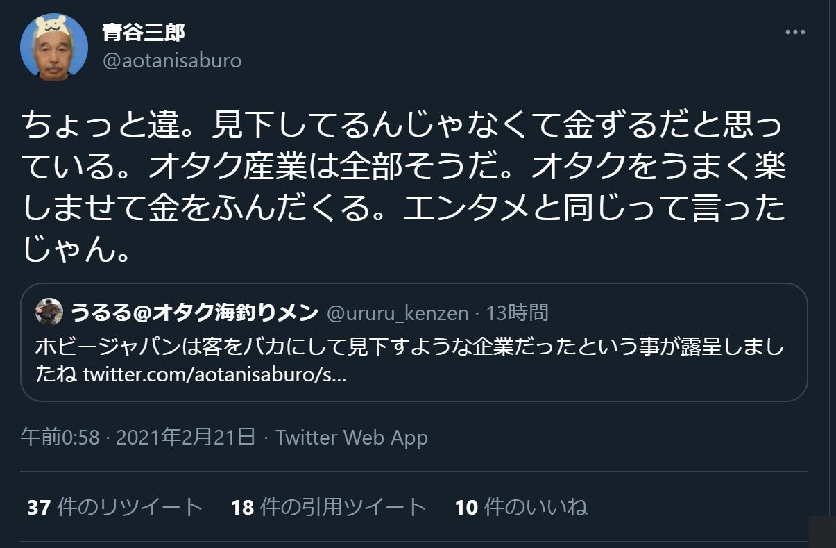 元ホビージャパンの人、オタクは金づるとまで言っちゃったのか。じゃあ、ホビージャパンに抗議しようにも元だから無敵すぎる