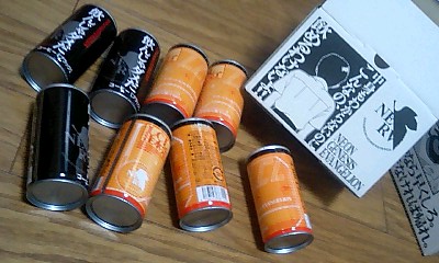 一番左が"LCL注入完了"缶、一番右が"飲んじゃダメだ"缶、そして中央が"初号機用エントリープラグ"貯金缶Death