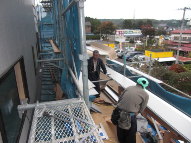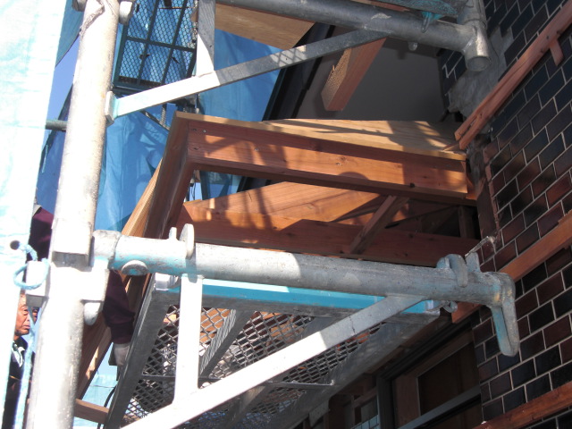 足場はひさしがありますので、タキロンを外して、現場に合わせて架けていきます。