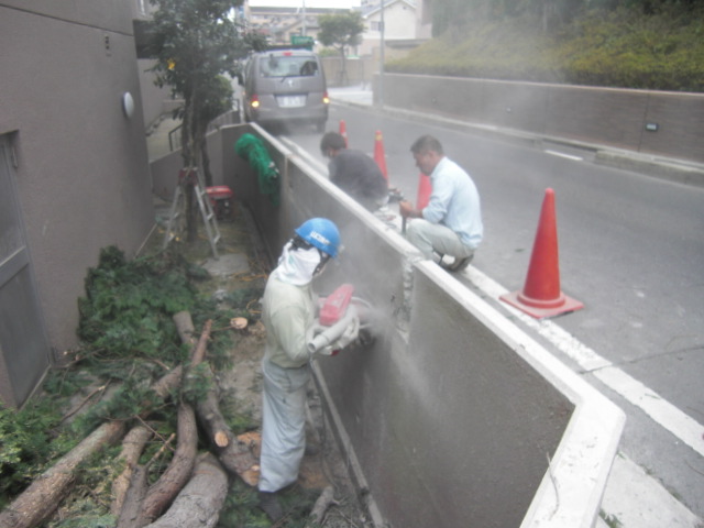 早速、本体工事の前の樹木伐採・伐根工事とコンクリート壁カッター、撤去工事です。