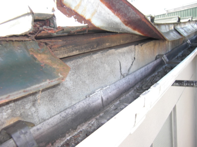1階のテナント事務所の勝手口のドア枠の内部からの漏水と言う事で、上部の屋根の鼻かくし部分がクラック・モルタル剥離が見えました。